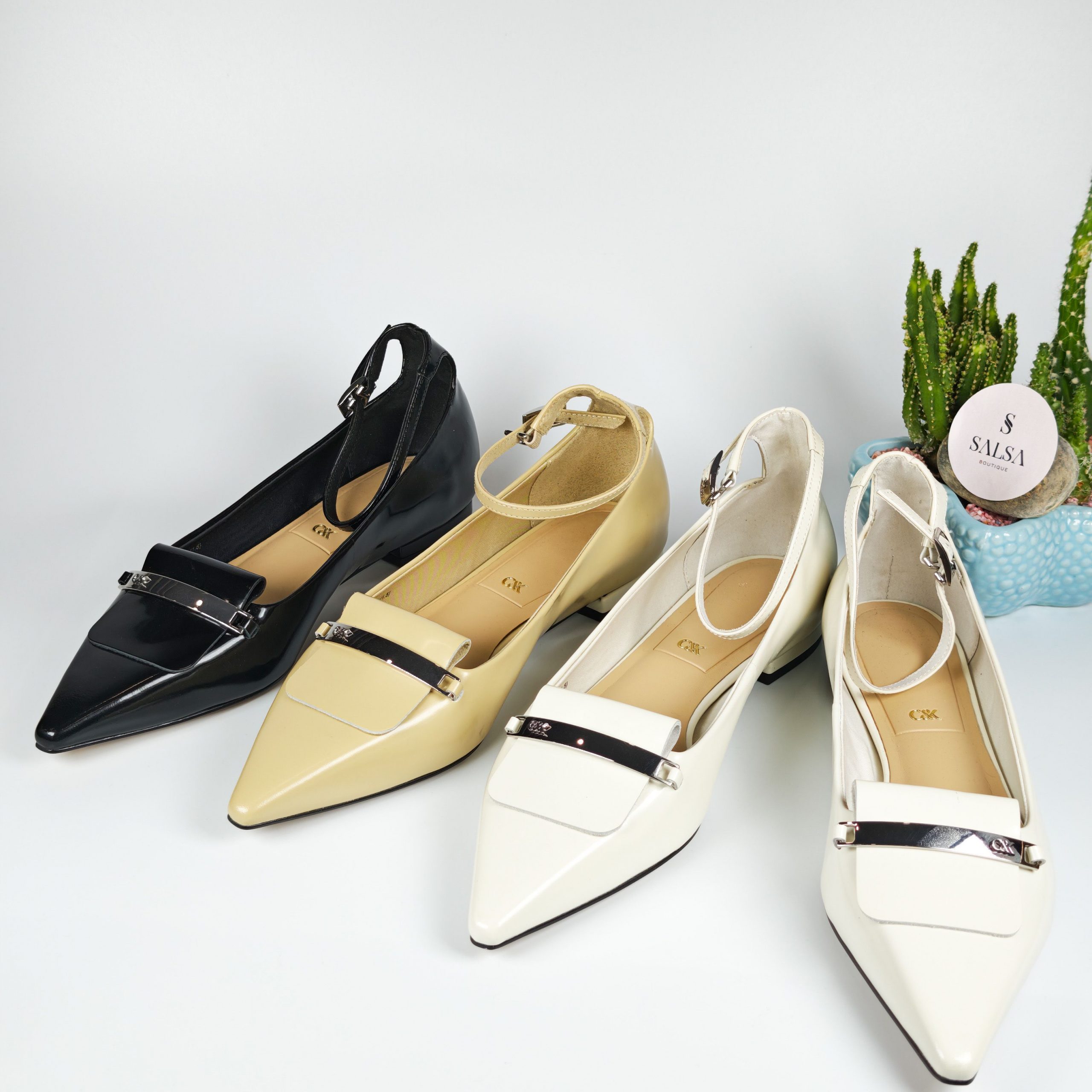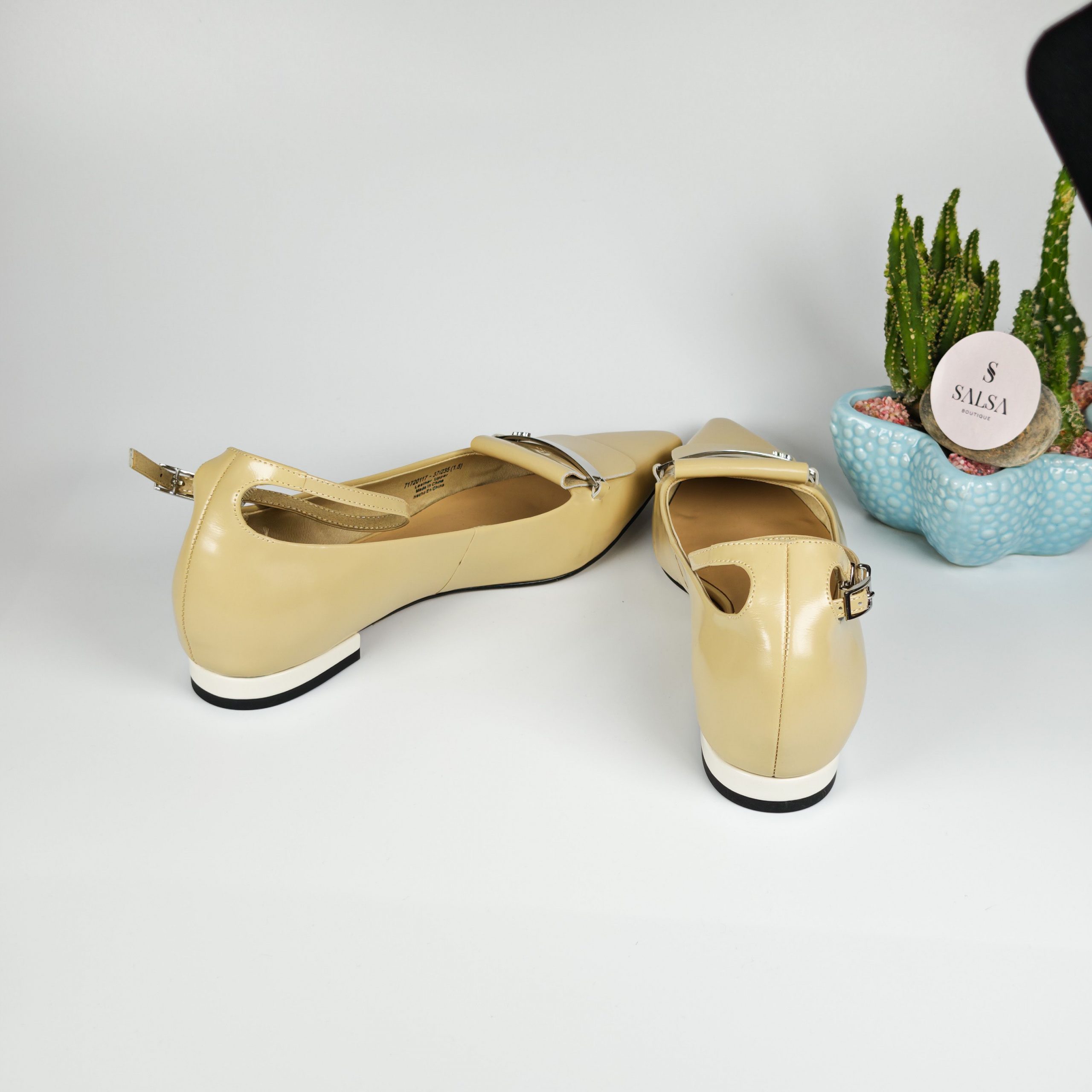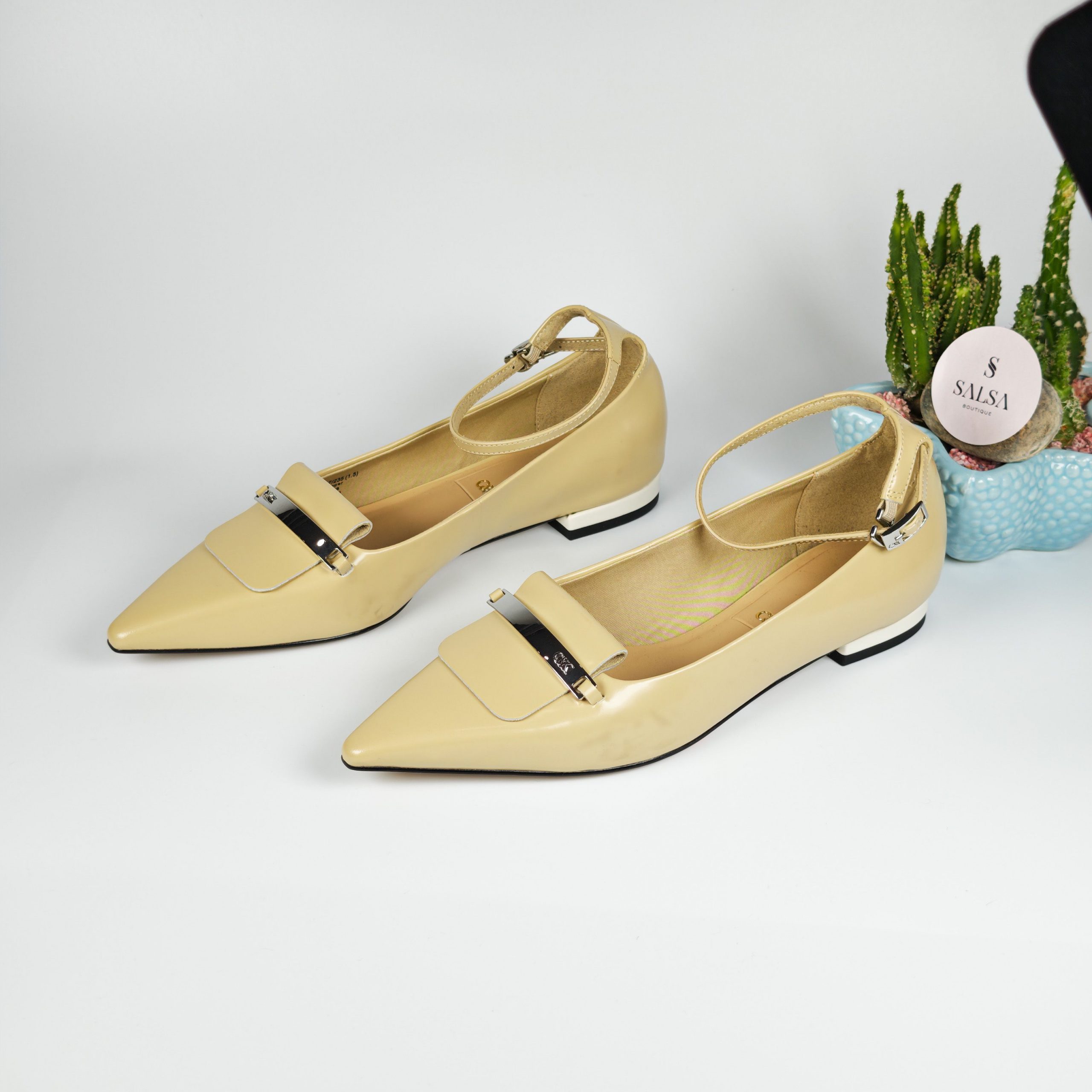 Đôi giày búp bê mũi nhọn với chất da bóng cao cấp và chi tiết khóa kim loại sang trọng tạo điểm nhấn tinh tế cho đôi chân. Phom dáng chuẩn, mũi nhọn giúp kéo dài chân, kết hợp đế thấp êm ái, dễ mang cả ngày mà không đau chân. Phù hợp đi làm, đi chơi, dự tiệc hoặc mix cùng váy – quần tây đều cực sang!