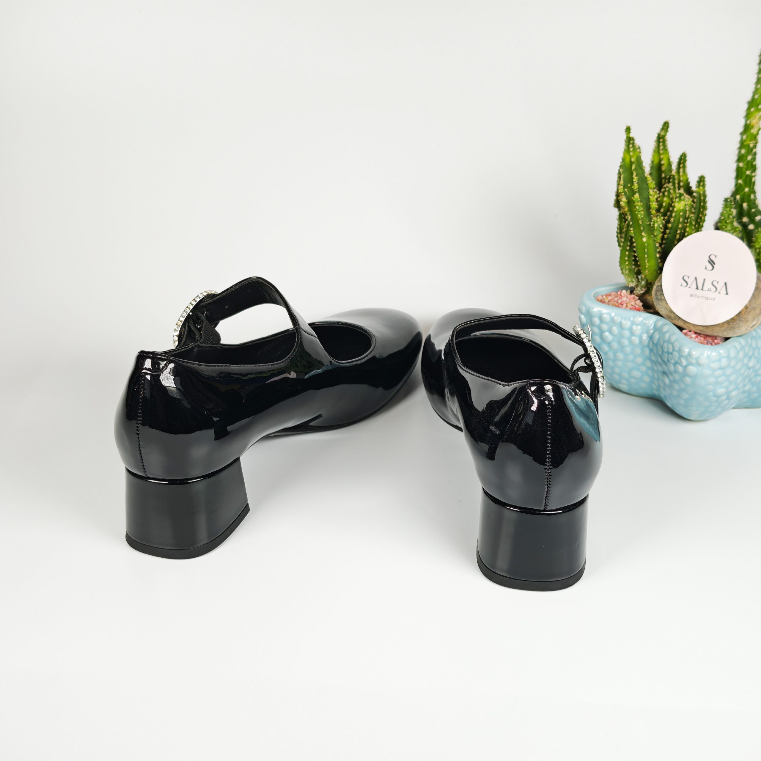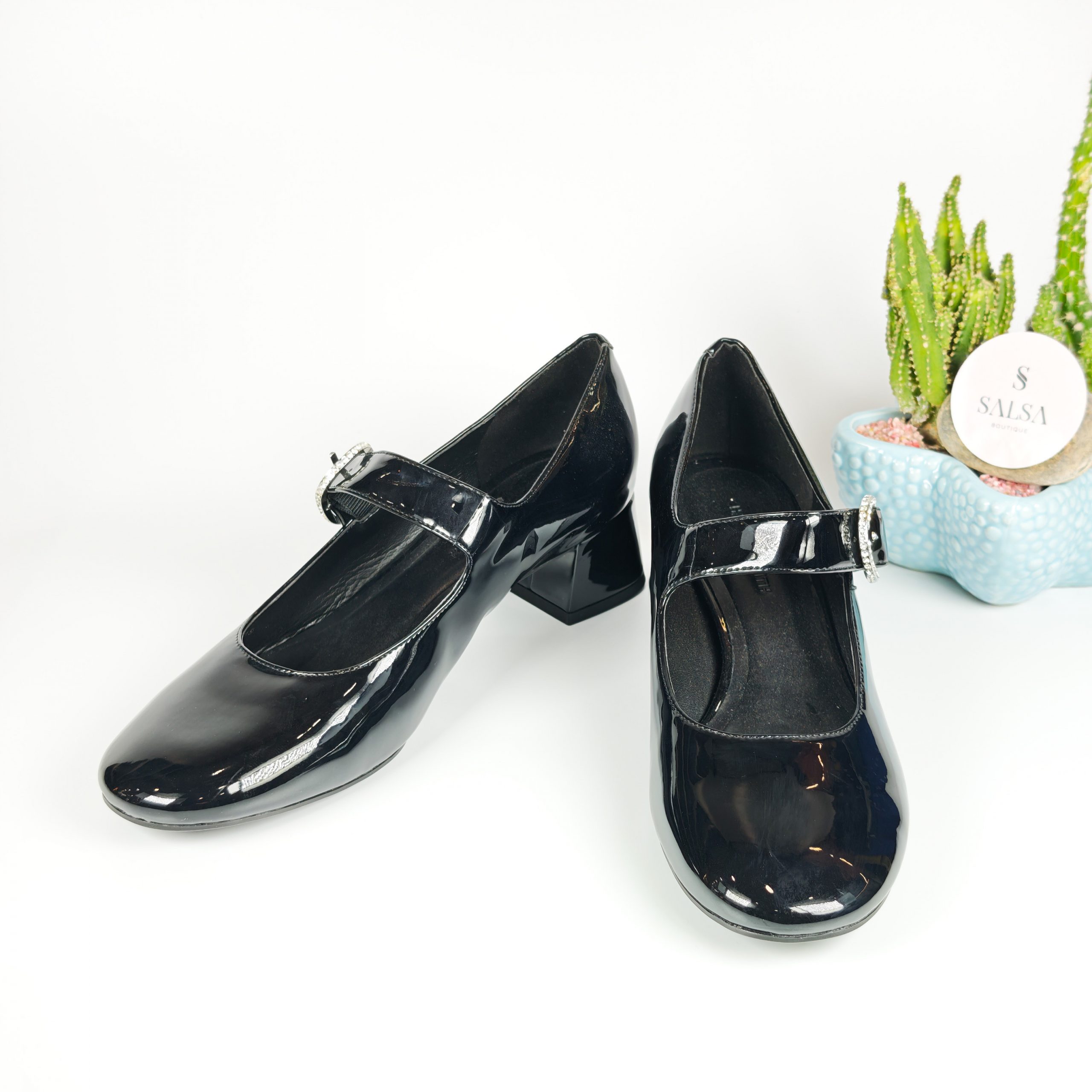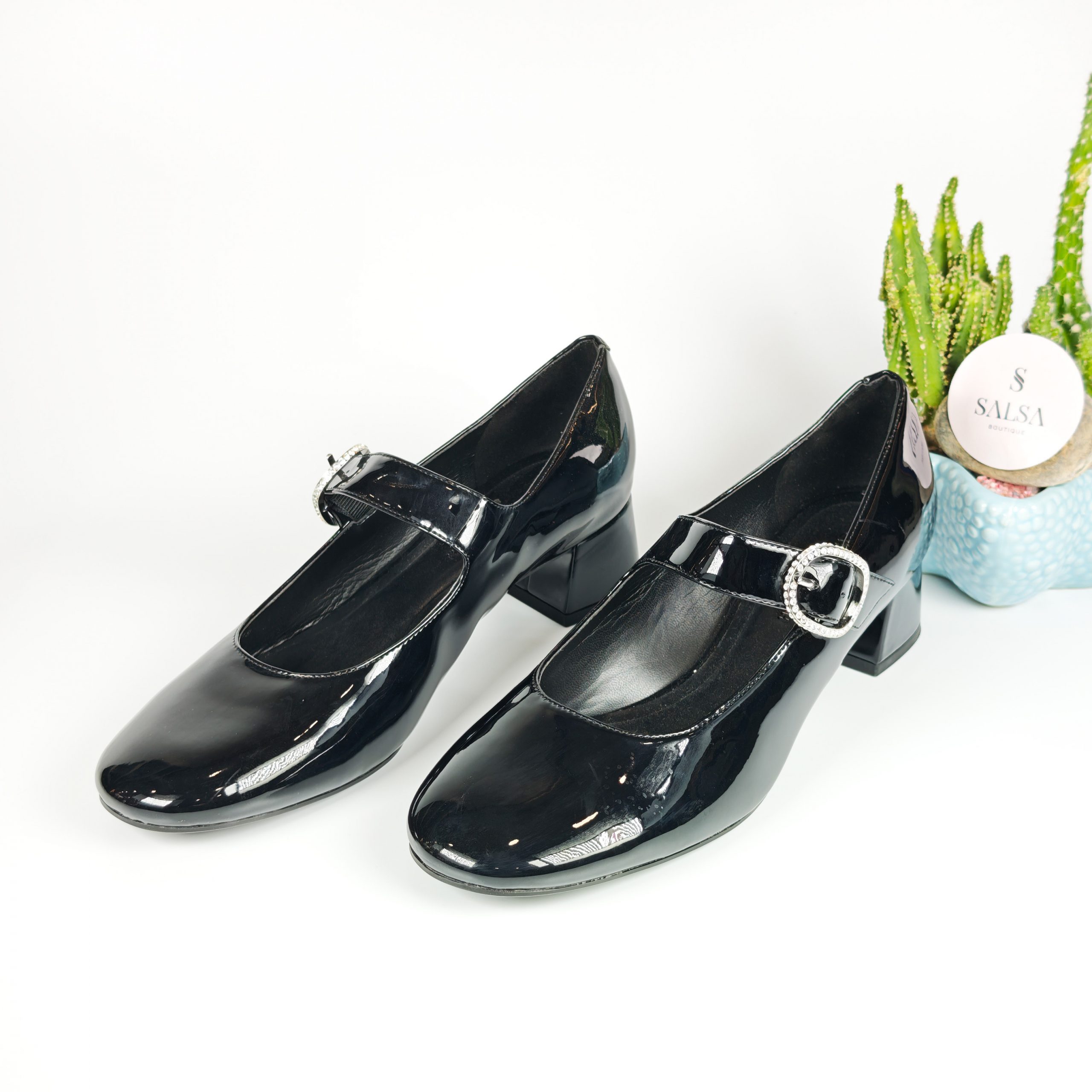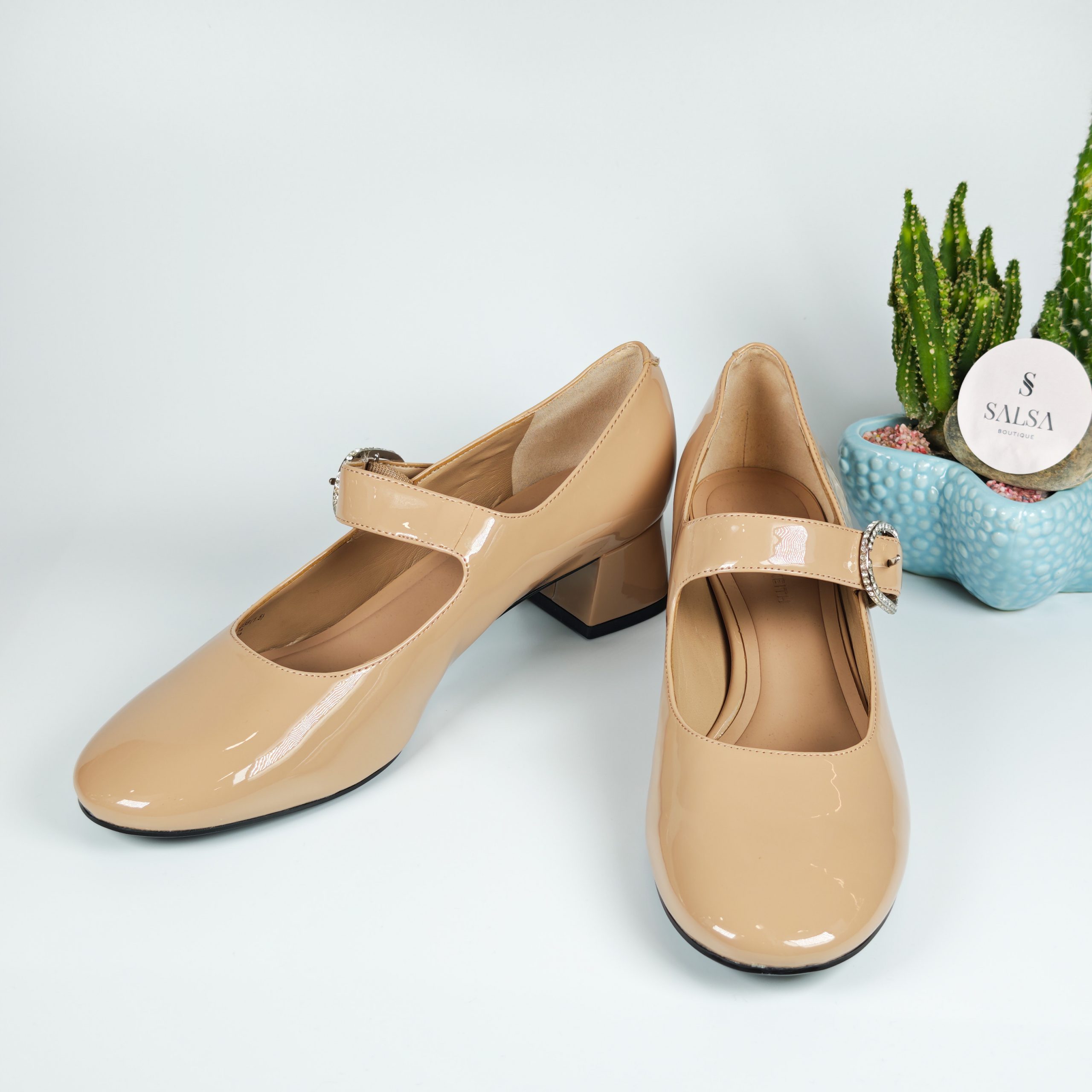 Lấy cảm hứng từ phong cách Mary Jane kinh điển, đôi giày được thiết kế với chất da bóng cao cấp và gót vuông thấp giúp tôn dáng nhẹ nhàng mà vẫn êm chân. Phần quai ngang đính khóa đá tinh tế mang đến điểm nhấn sang trọng, phù hợp cho cả đi làm, đi tiệc hay dạo phố.