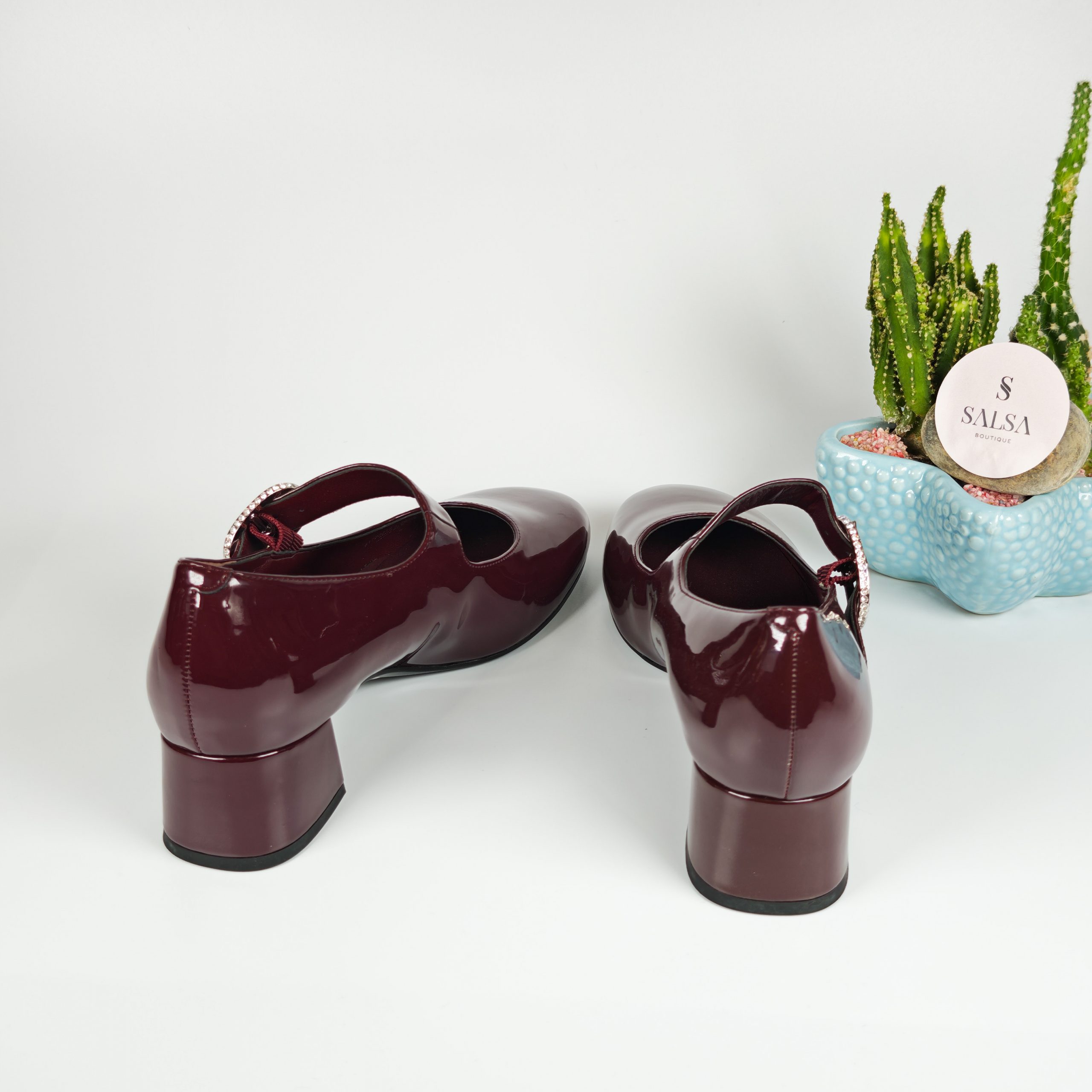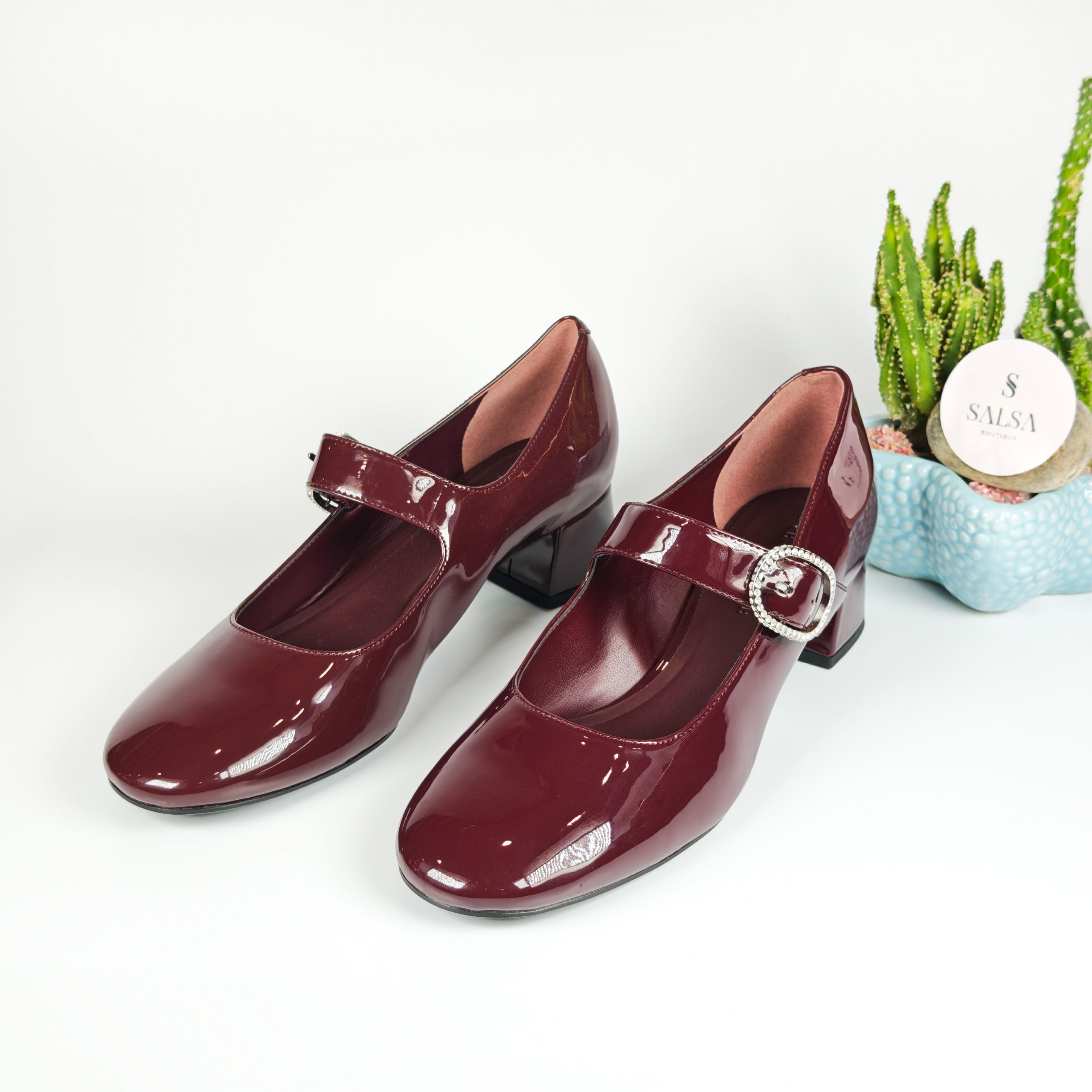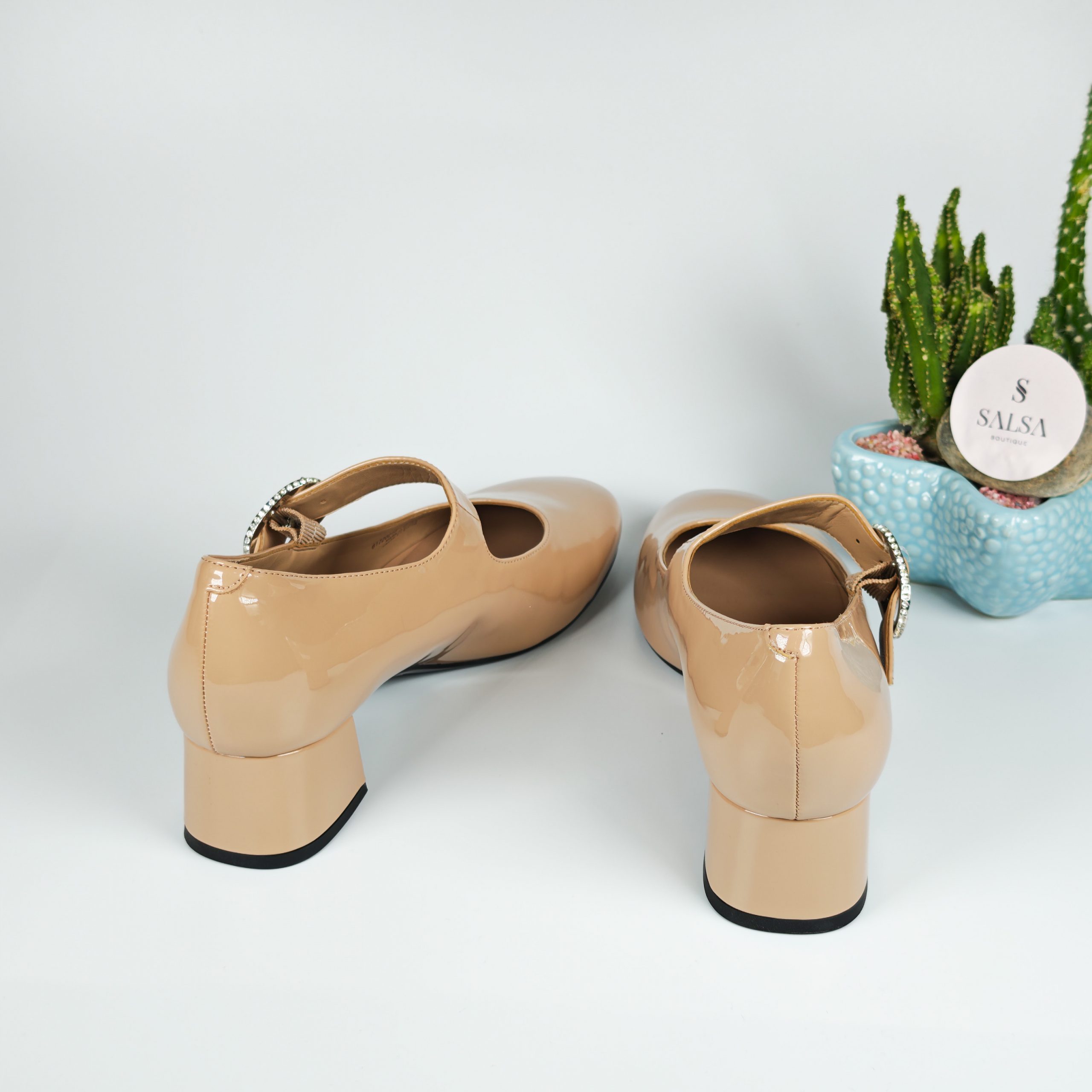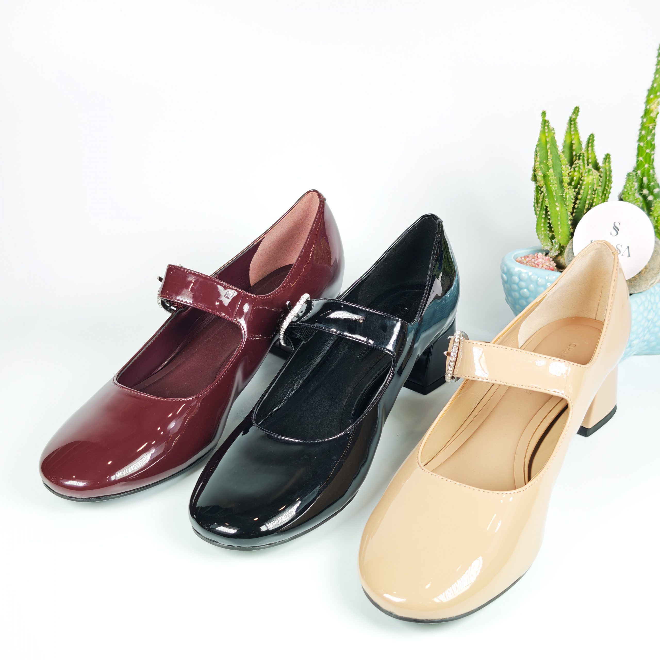 Lấy cảm hứng từ phong cách Mary Jane kinh điển, đôi giày được thiết kế với chất da bóng cao cấp và gót vuông thấp giúp tôn dáng nhẹ nhàng mà vẫn êm chân. Phần quai ngang đính khóa đá tinh tế mang đến điểm nhấn sang trọng, phù hợp cho cả đi làm, đi tiệc hay dạo phố.