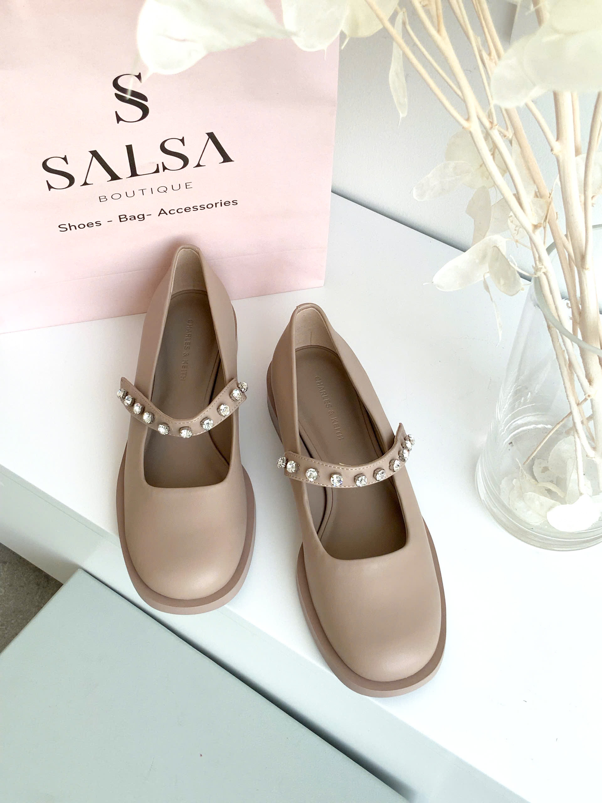 Giày búp bê kiểu dáng đơn giản, thanh lịch với màu trang nhã dễ dàng phối hợp với nhiều trang phục khác nhau. Điểm nhấn nổi bật là quai đeo ngang mặt chân đính các viên pha lê lấp lánh, tạo sự sang trọng và cuốn hút