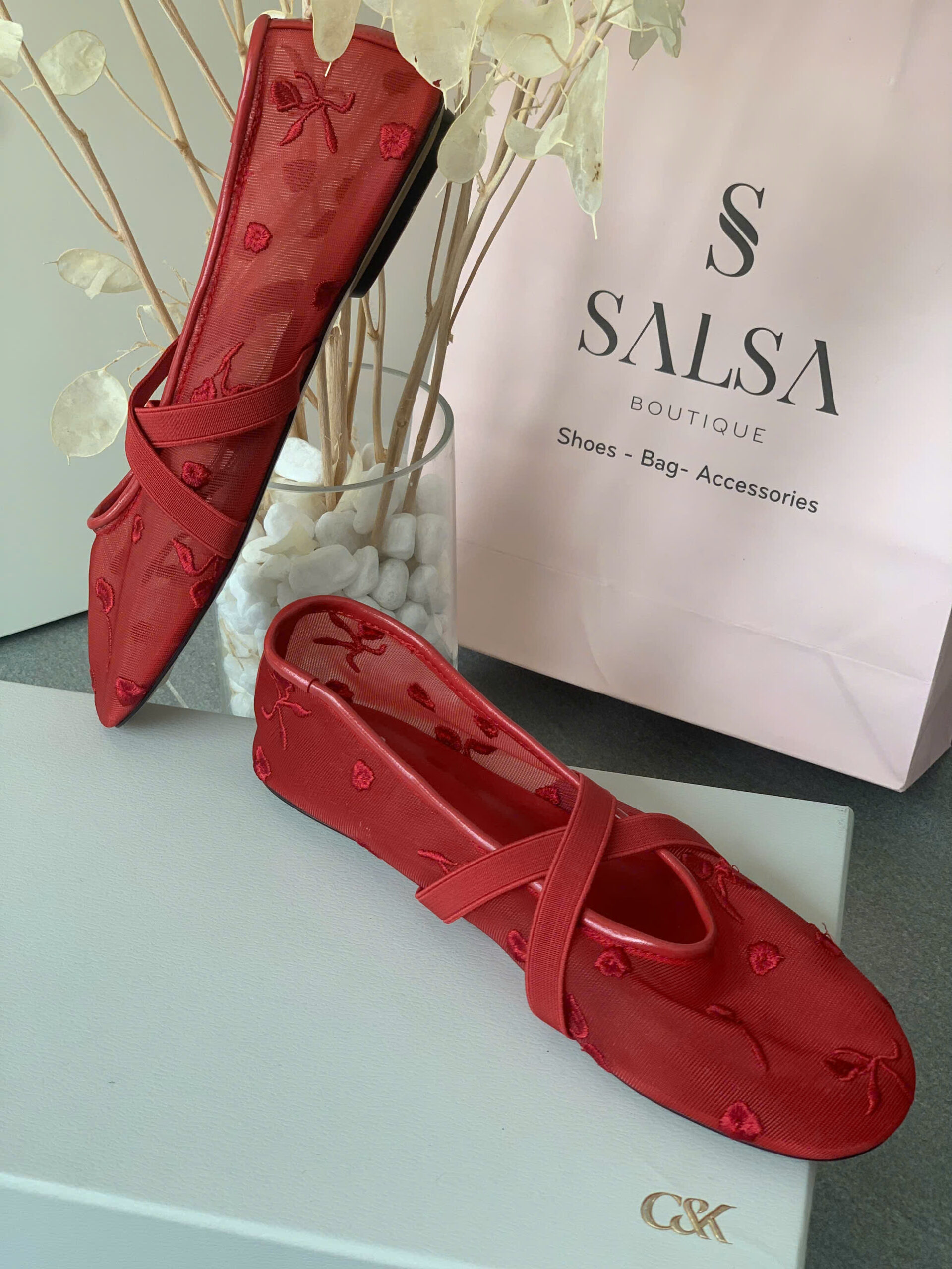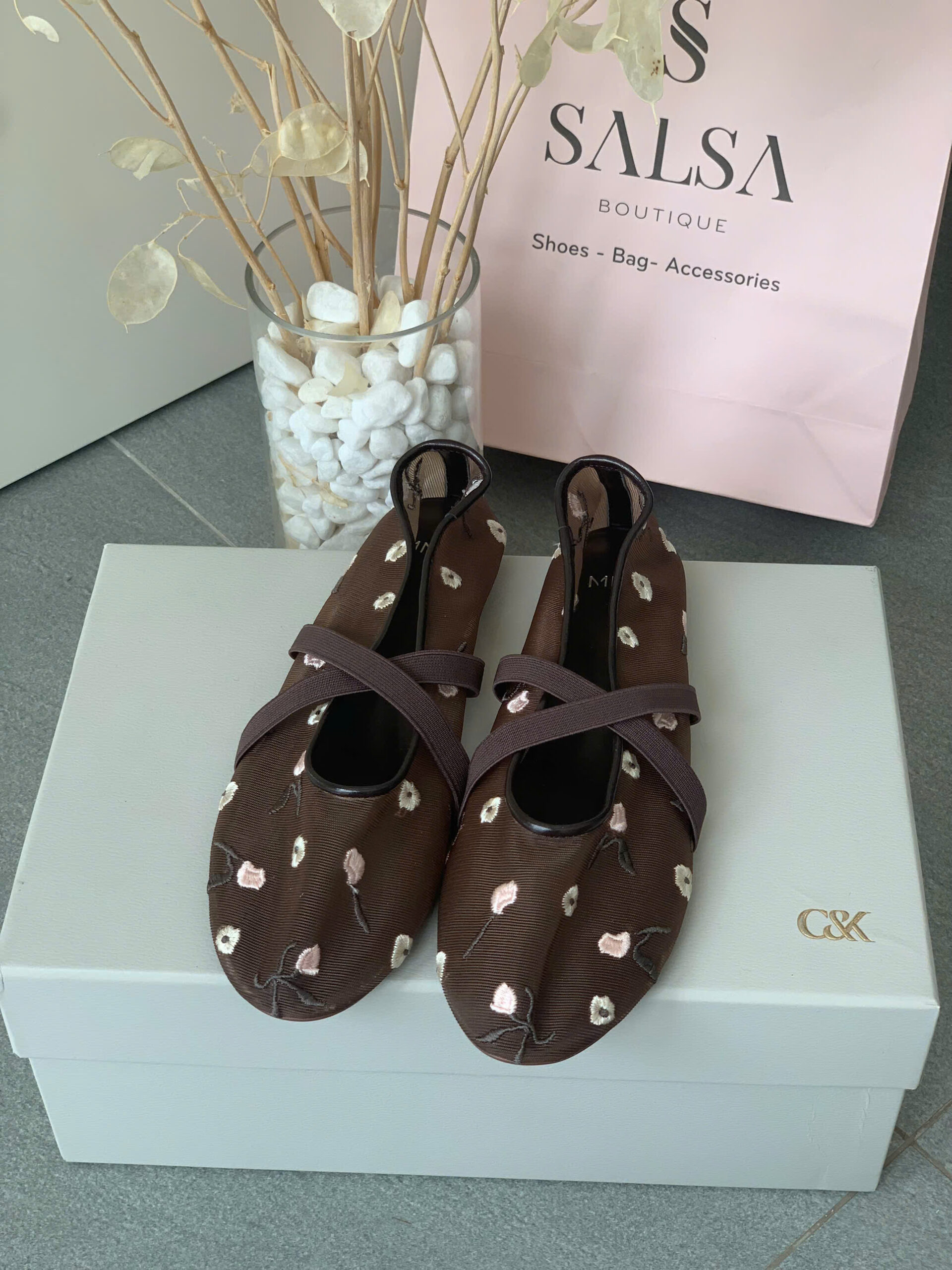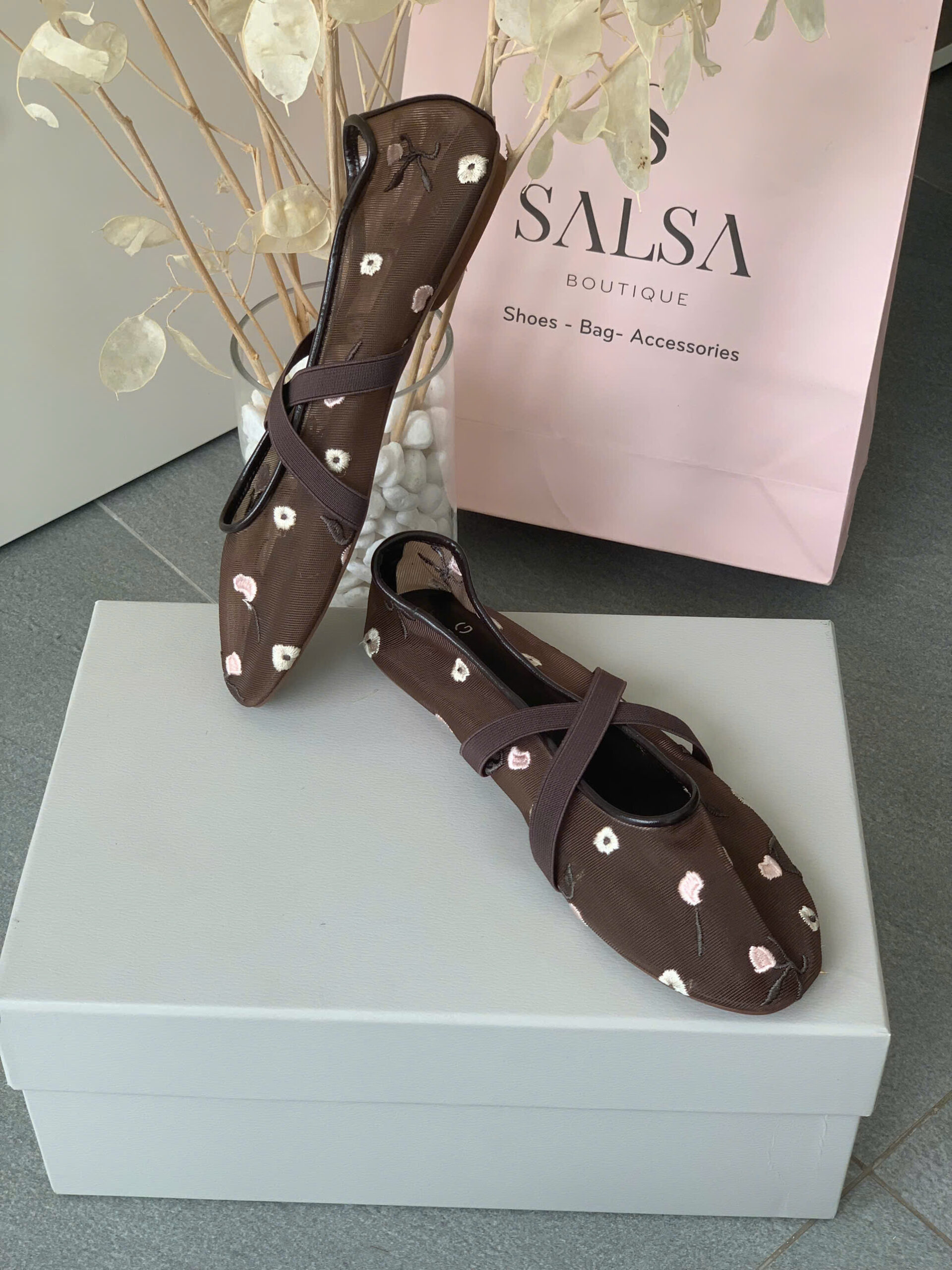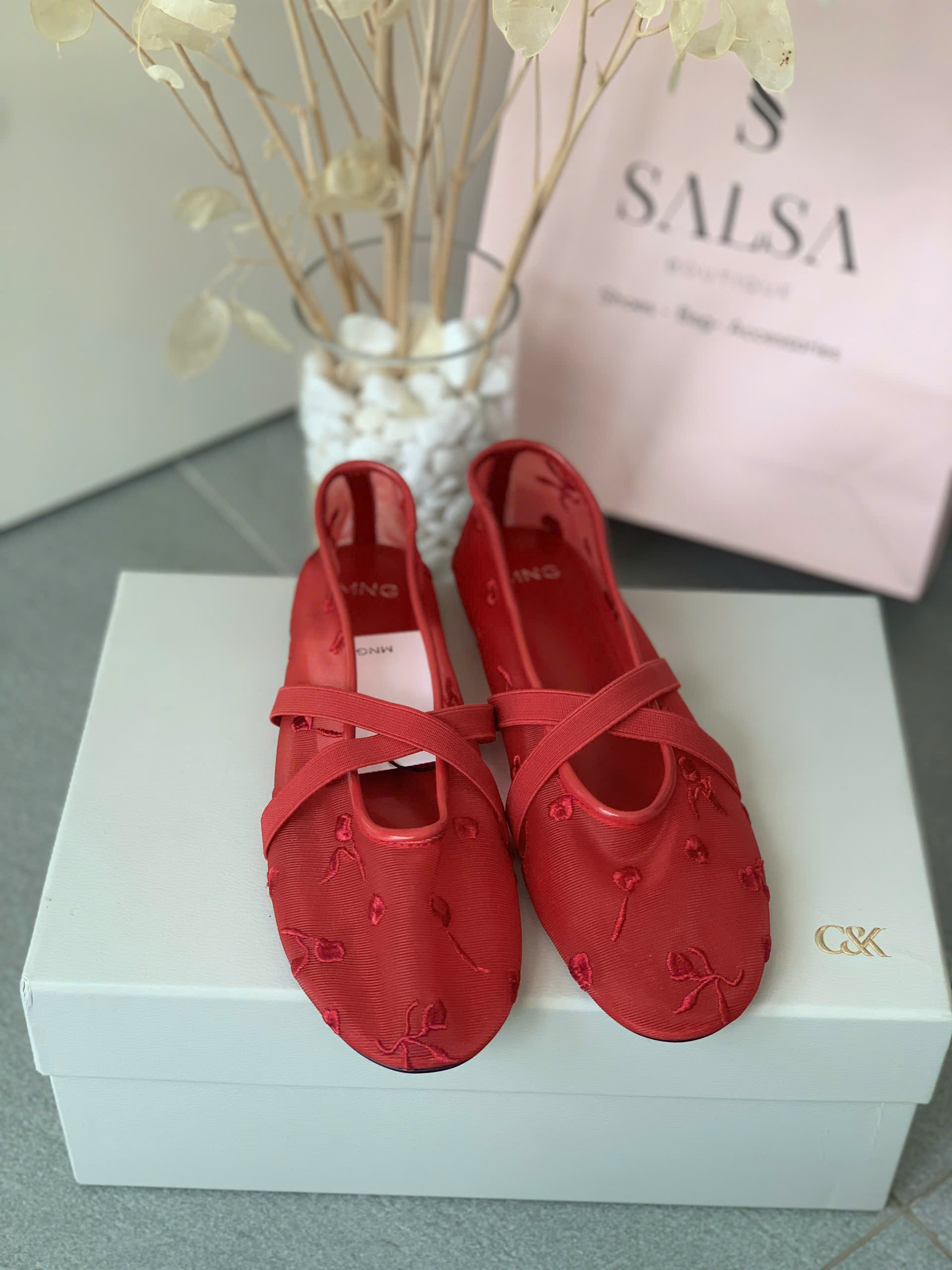 Giày búp bê MNG lưới thêu hoa quai chéo