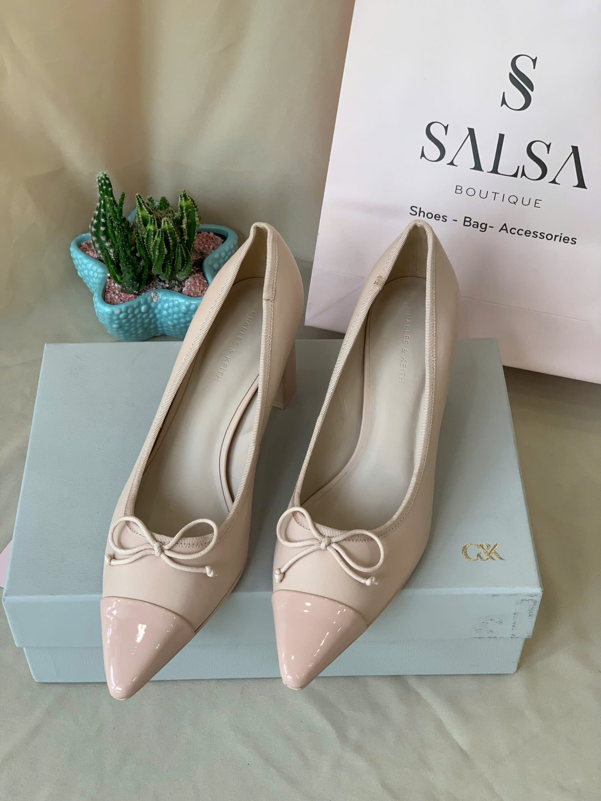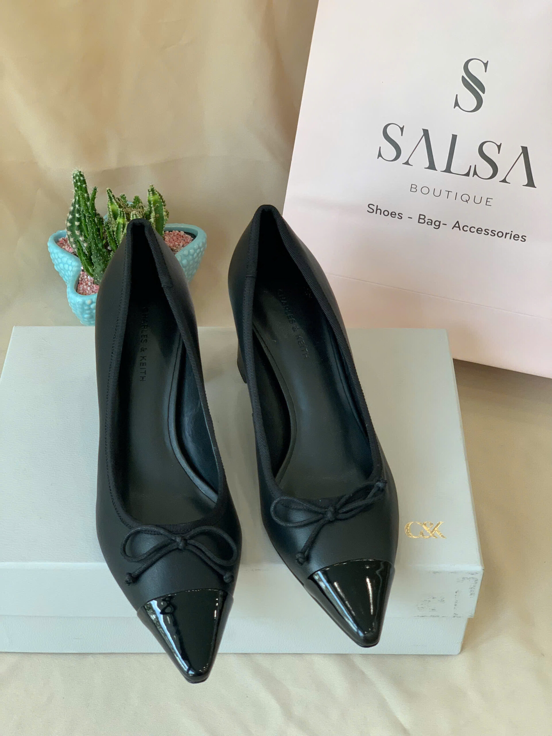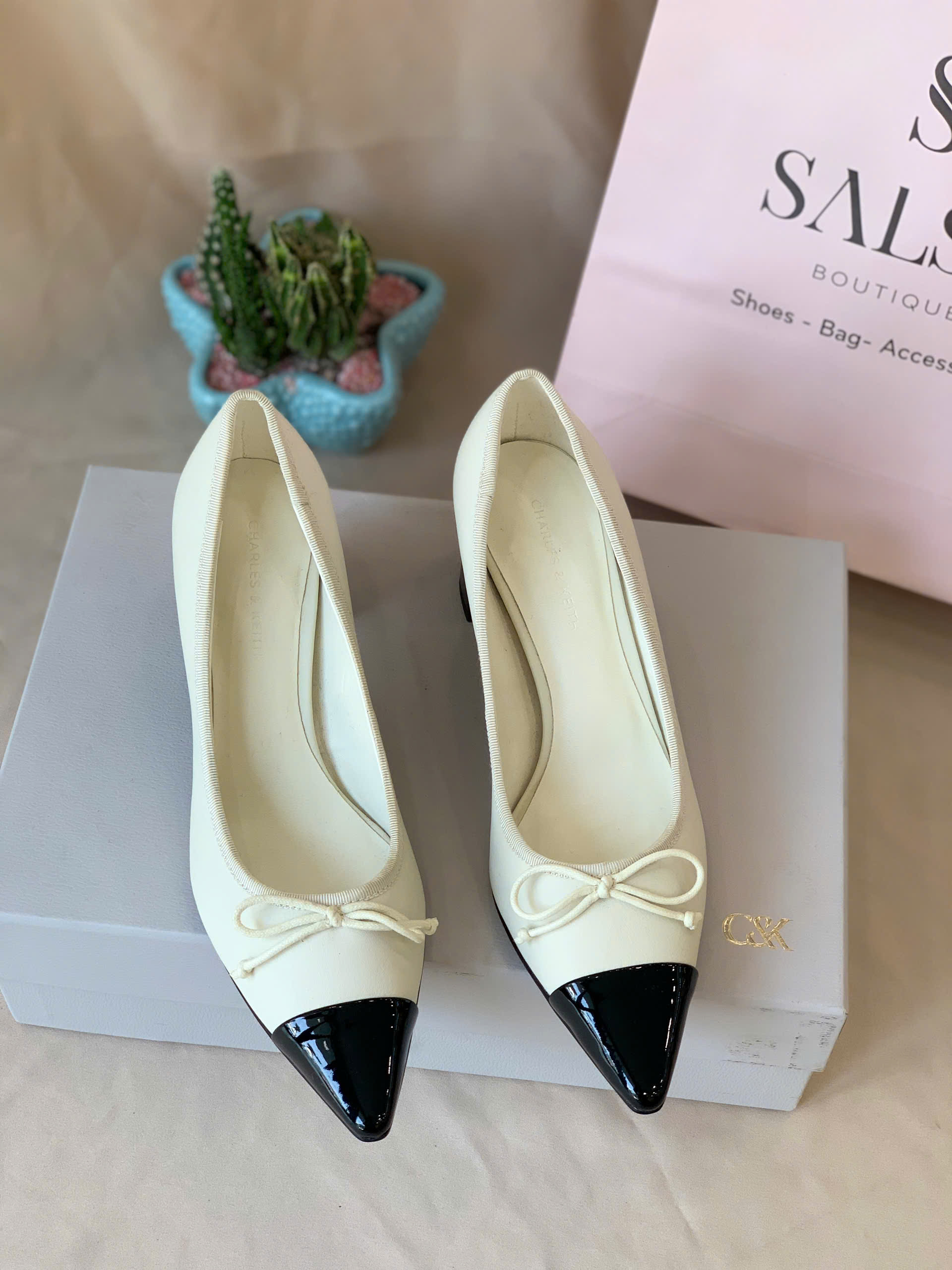Thiết kế mũi nhọn phối hai tông màu đen – trắng tinh tế, mang hơi hướng cổ điển pha nét hiện đại. Điểm nhấn là chiếc nơ nhỏ xinh tạo vẻ duyên dáng nữ tính. – Kiểu dáng: Giày cao gót – Chất liệu: PU – Chiều cao: 5cm