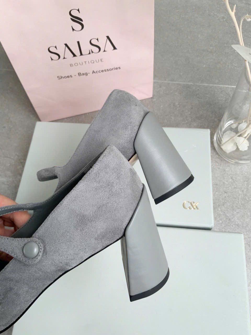 Đôi giày cao gót với thiết kế mũi nhọn và phần quai ngang độc đáo. Chất liệu da lộn mềm mại kết hợp với đế vuông vững chãi tạo nên sự sang trọng và thoải mái khi di chuyển. Chi tiết nút bấm ở quai giày tạo điểm nhấn nổi bật, mang đến vẻ đẹp thanh lịch, thích hợp cho các dịp công sở hoặc dạo phố.