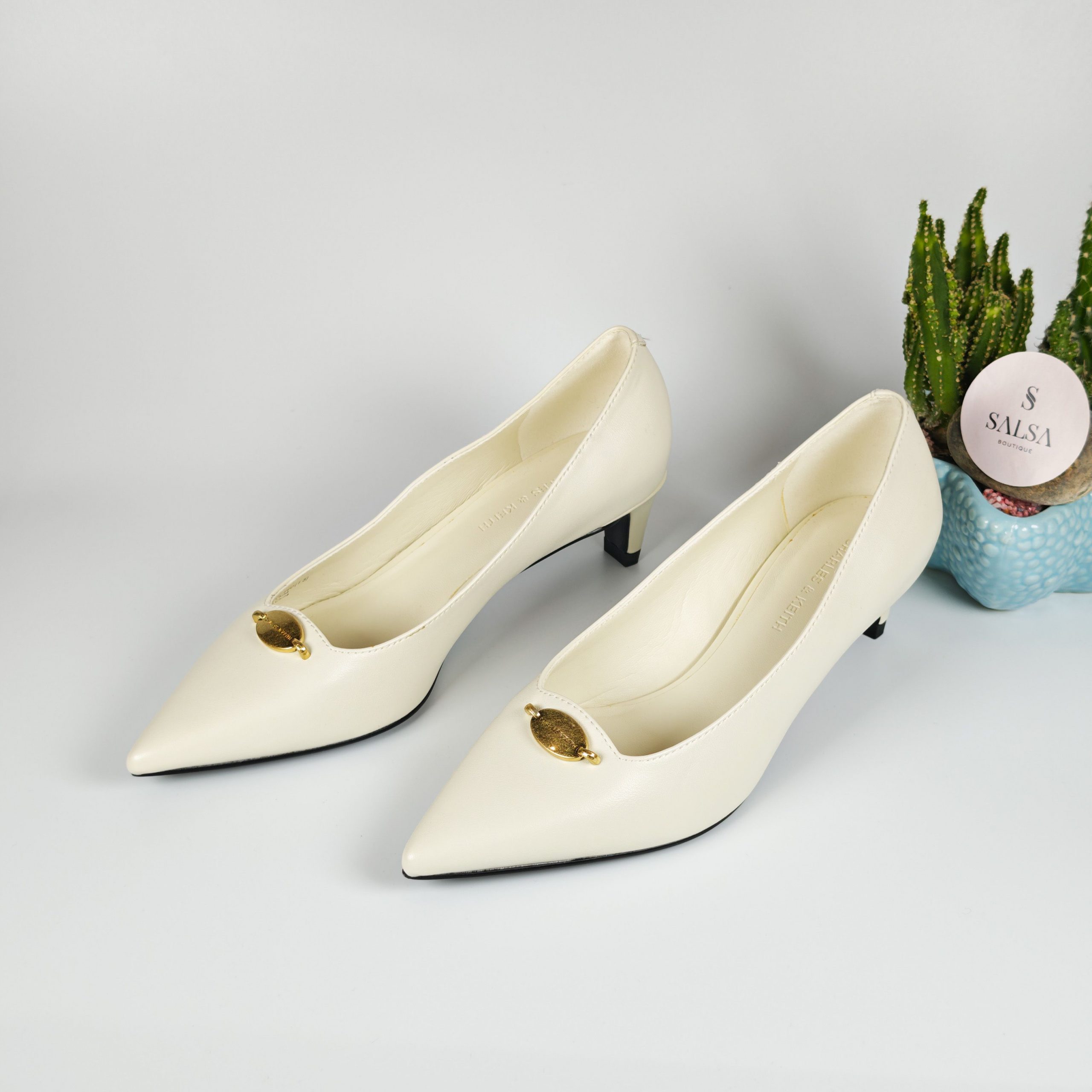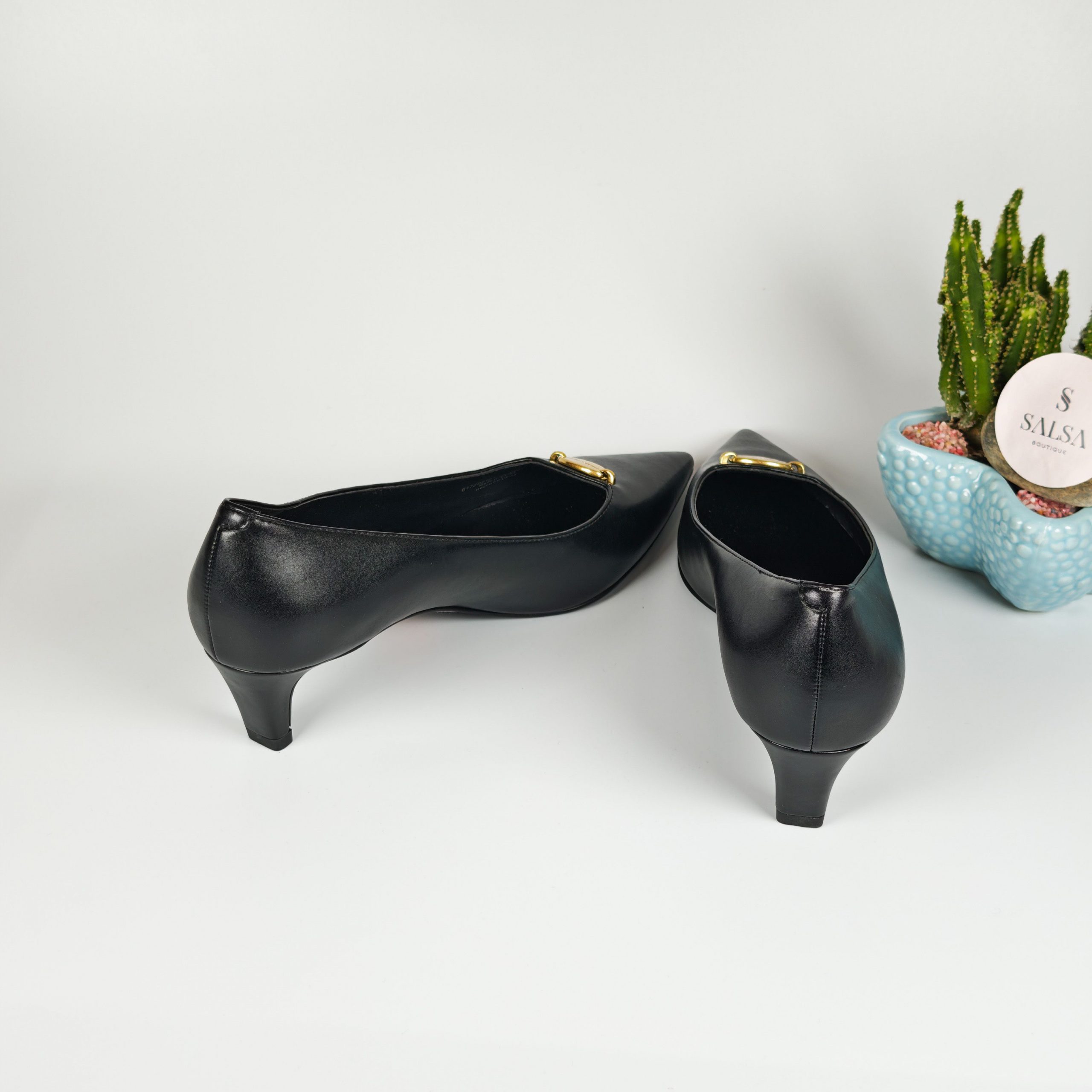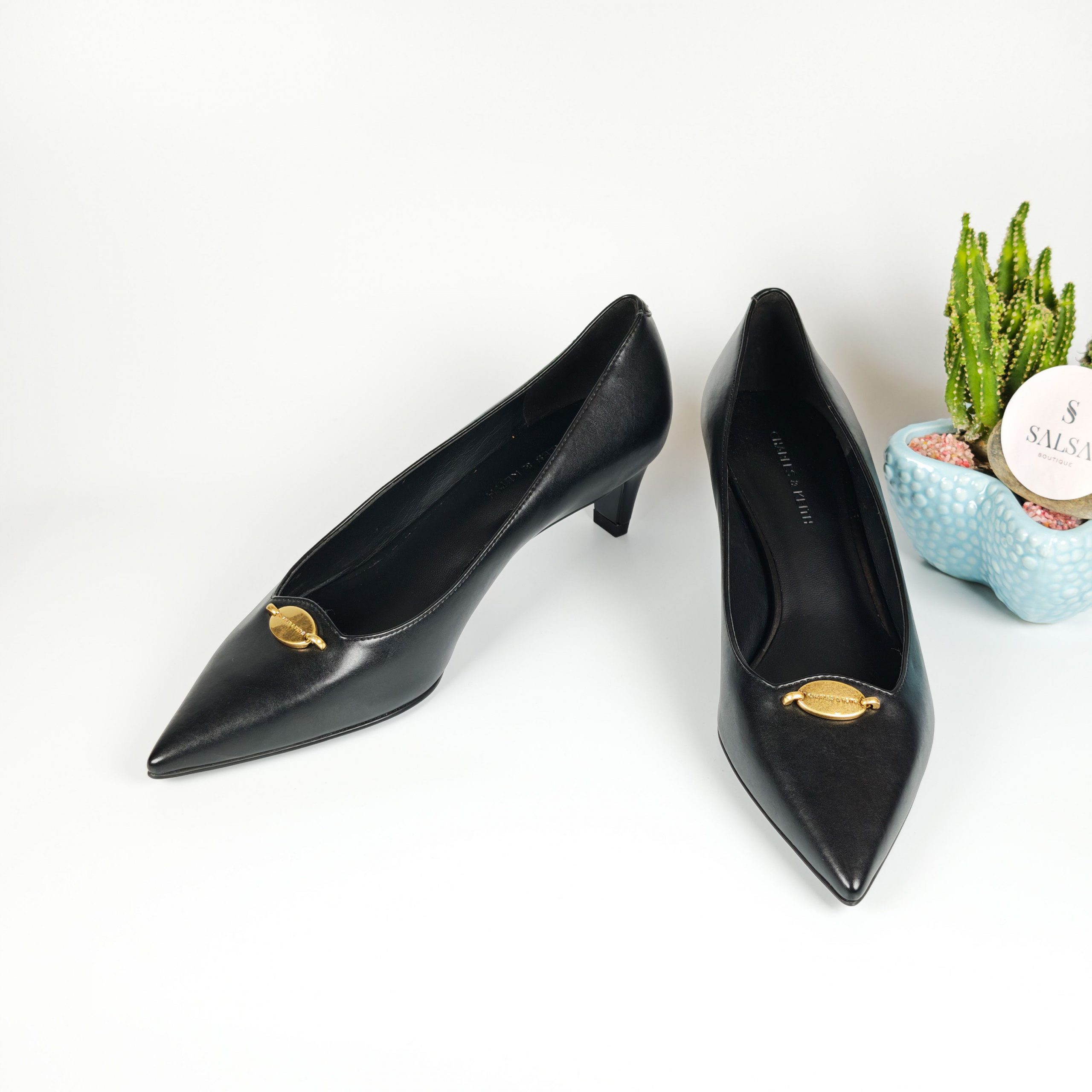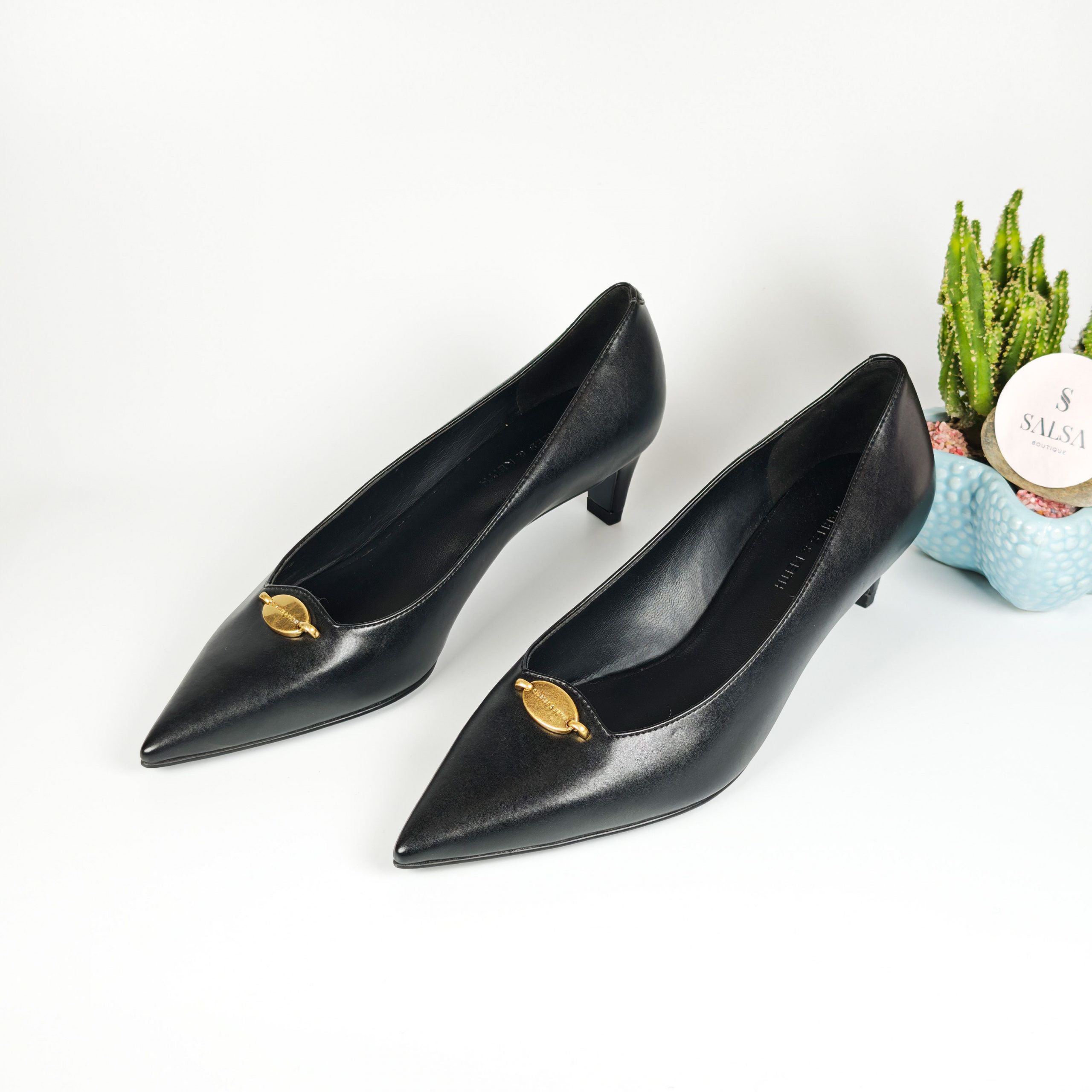 Đôi giày mũi nhọn màu đen kinh điển với điểm nhấn charm vàng kim loại giúp tôn lên sự tinh tế và đẳng cấp trong từng bước chân. Thiết kế gót nhọn thấp 5cm vừa đủ cao để kéo dài dáng, vừa đảm bảo thoải mái suốt cả ngày.