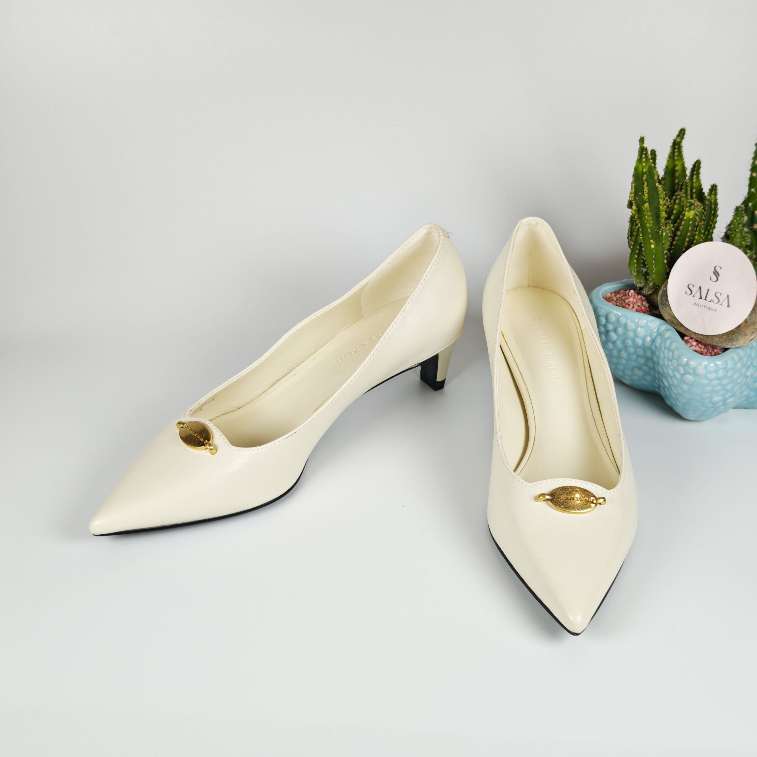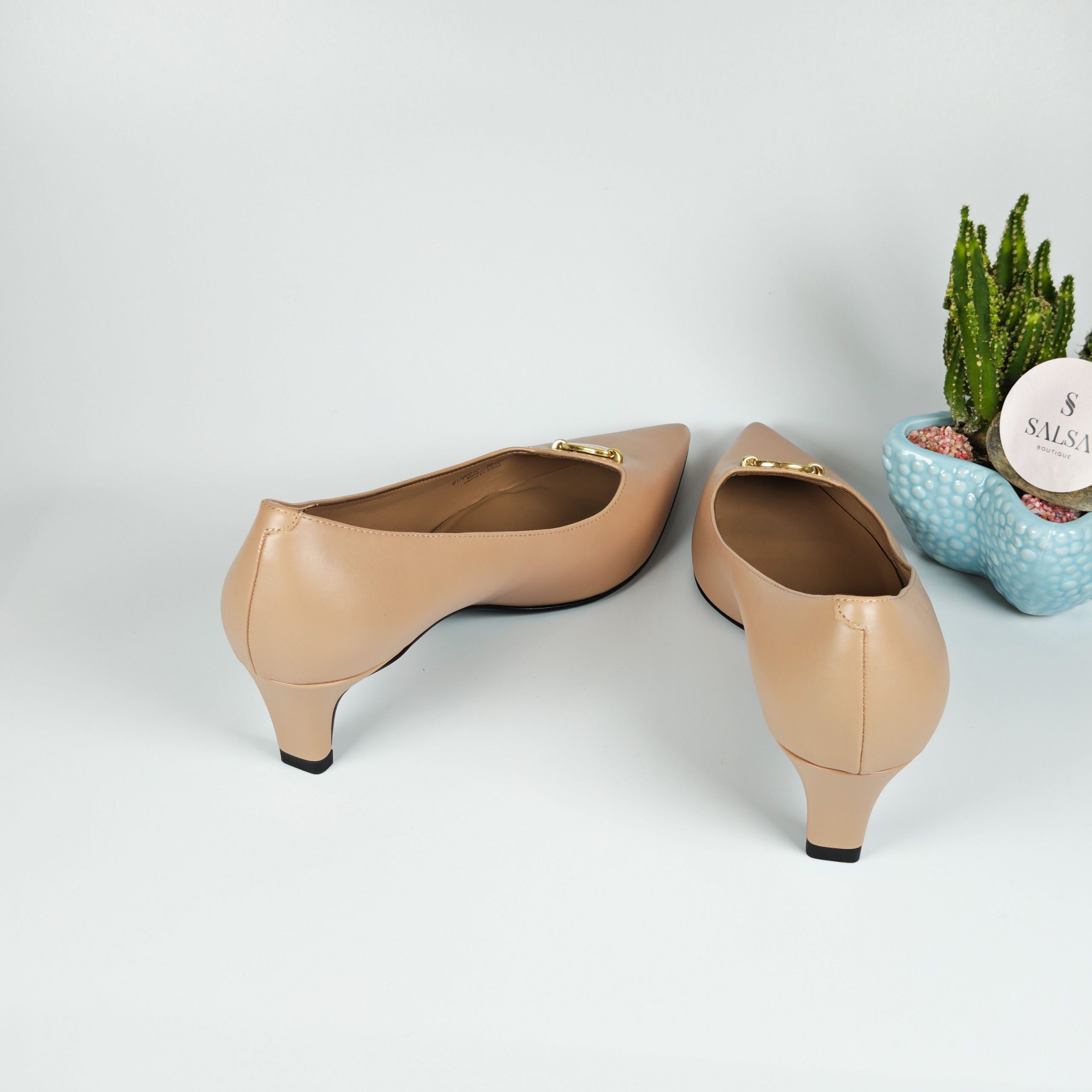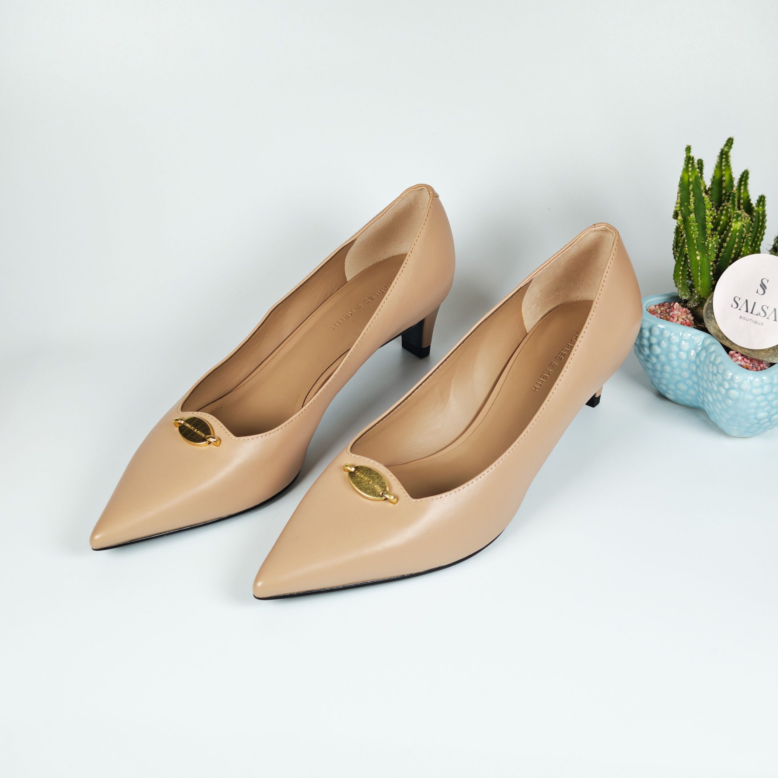 Đôi giày mũi nhọn màu đen kinh điển với điểm nhấn charm vàng kim loại giúp tôn lên sự tinh tế và đẳng cấp trong từng bước chân. Thiết kế gót nhọn thấp 5cm vừa đủ cao để kéo dài dáng, vừa đảm bảo thoải mái suốt cả ngày.
