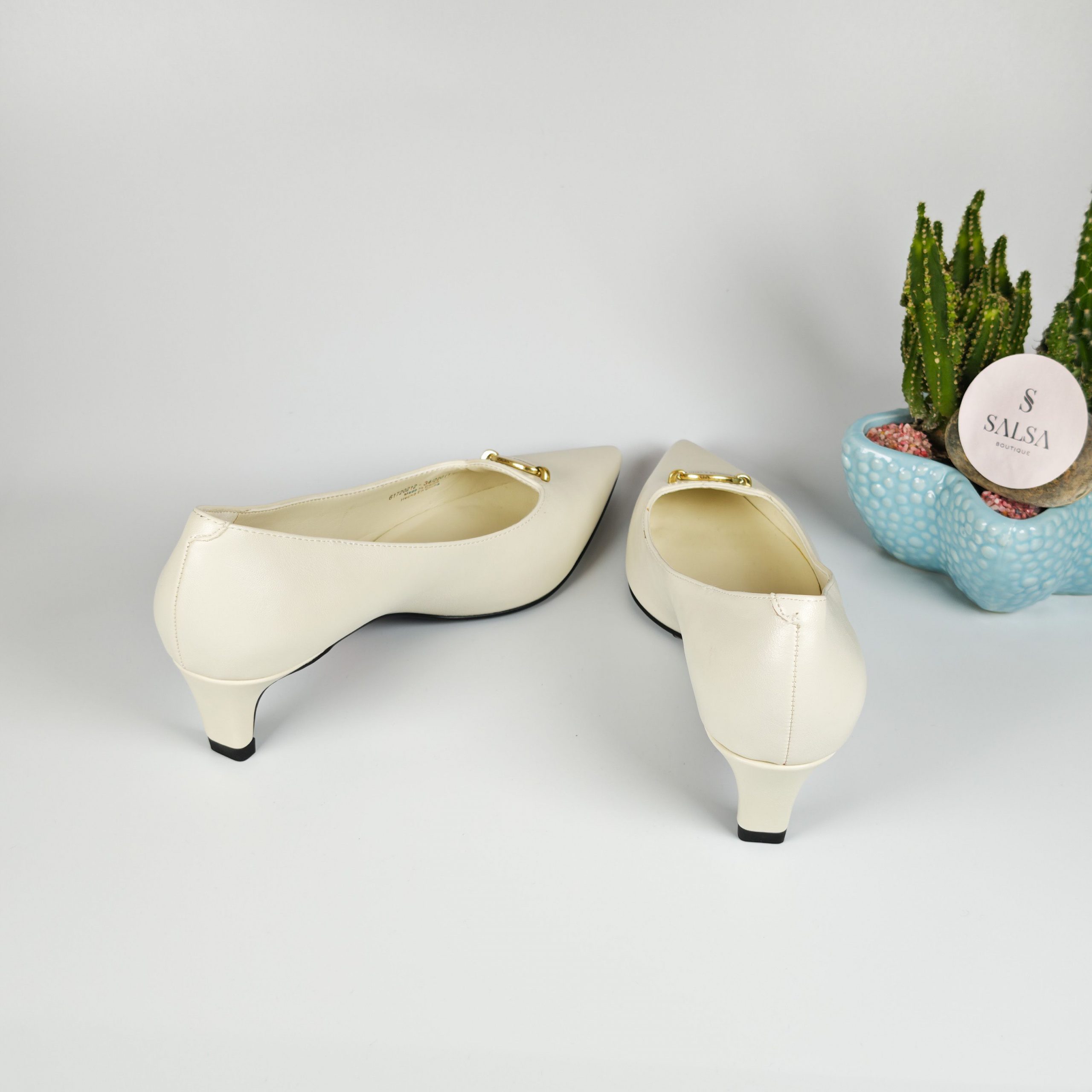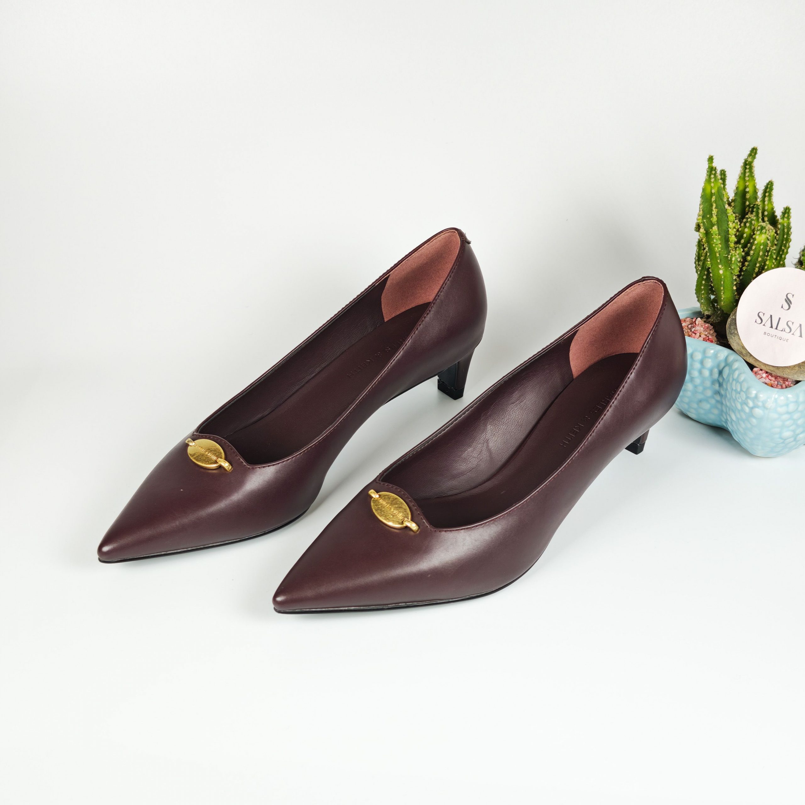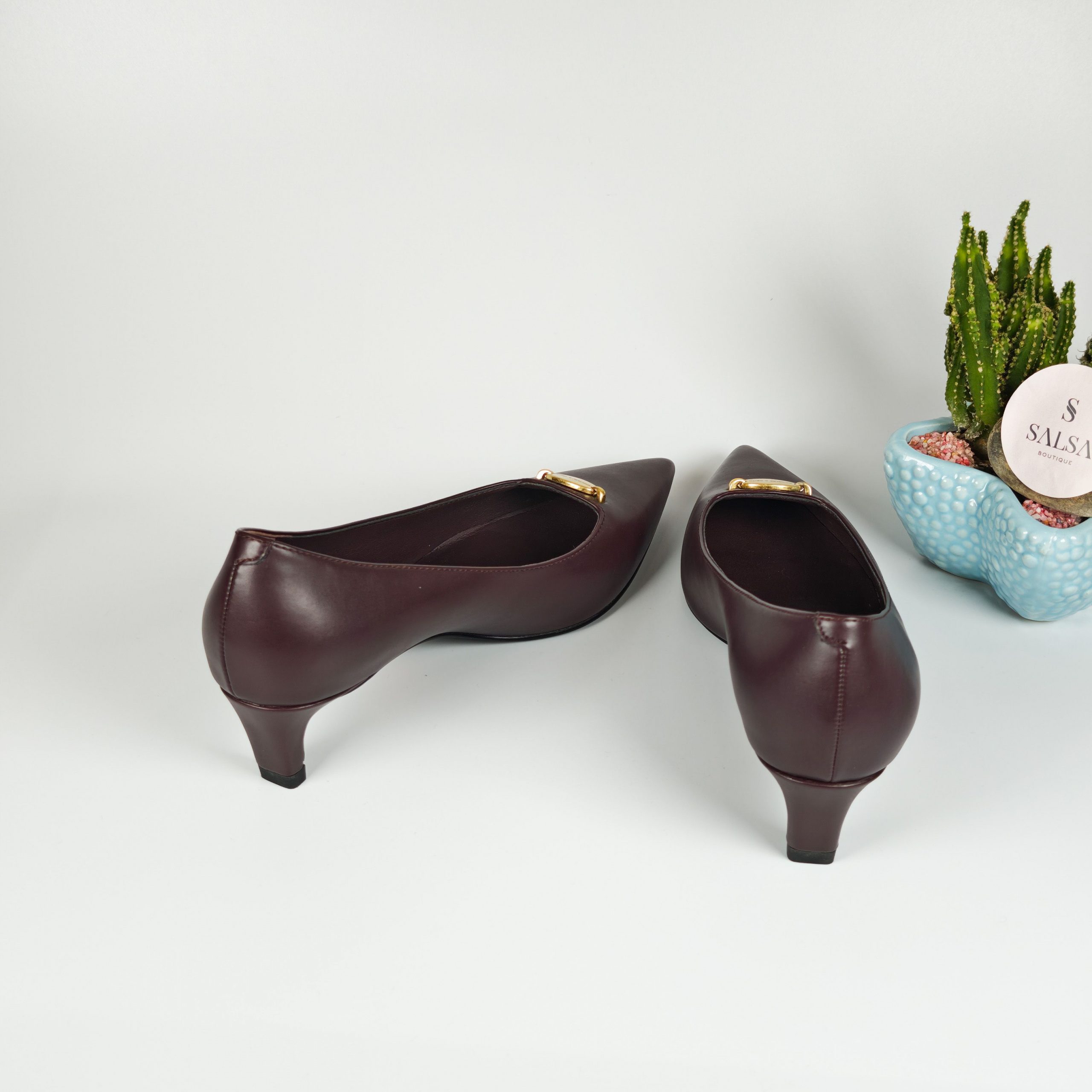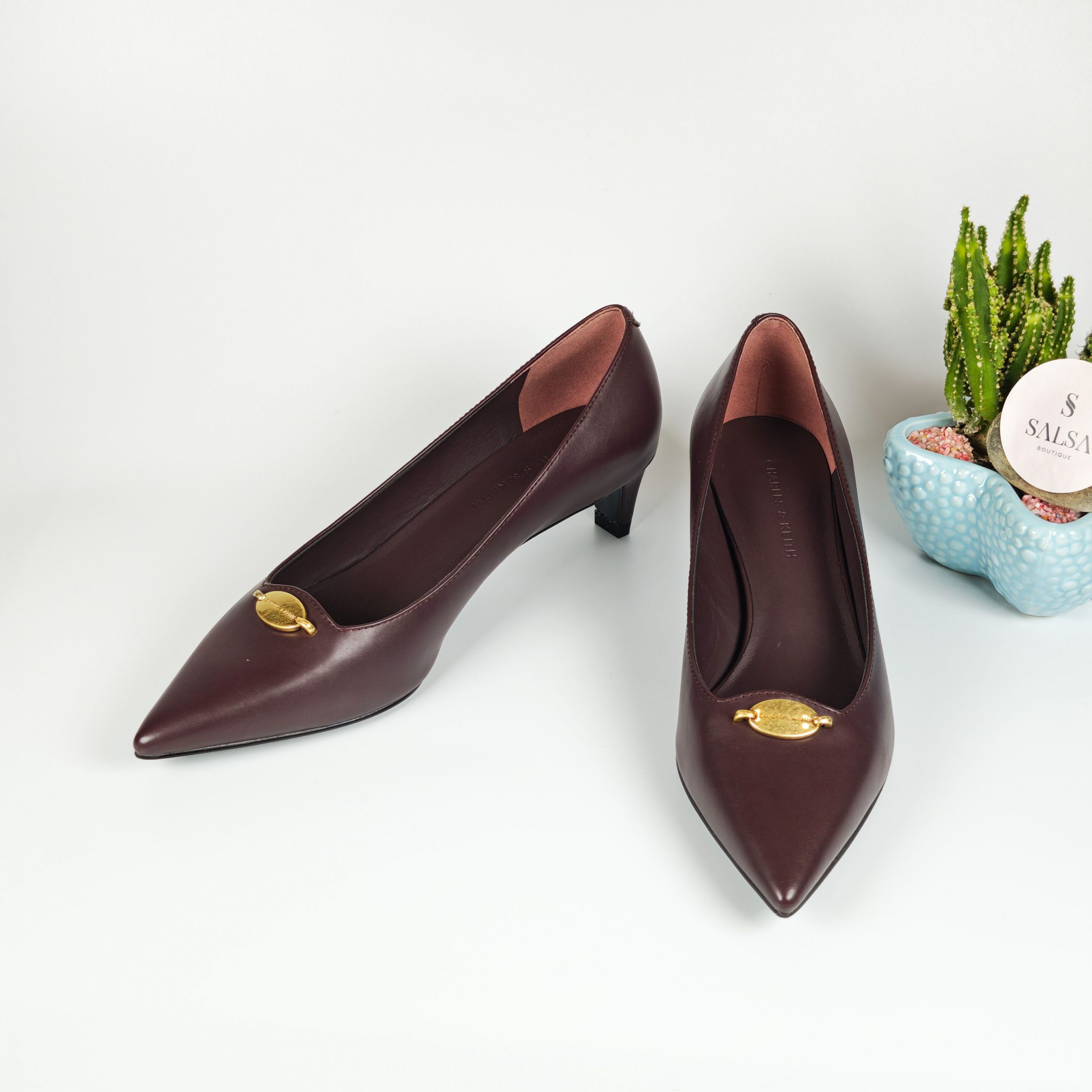 Đôi giày mũi nhọn màu đen kinh điển với điểm nhấn charm vàng kim loại giúp tôn lên sự tinh tế và đẳng cấp trong từng bước chân. Thiết kế gót nhọn thấp 5cm vừa đủ cao để kéo dài dáng, vừa đảm bảo thoải mái suốt cả ngày.