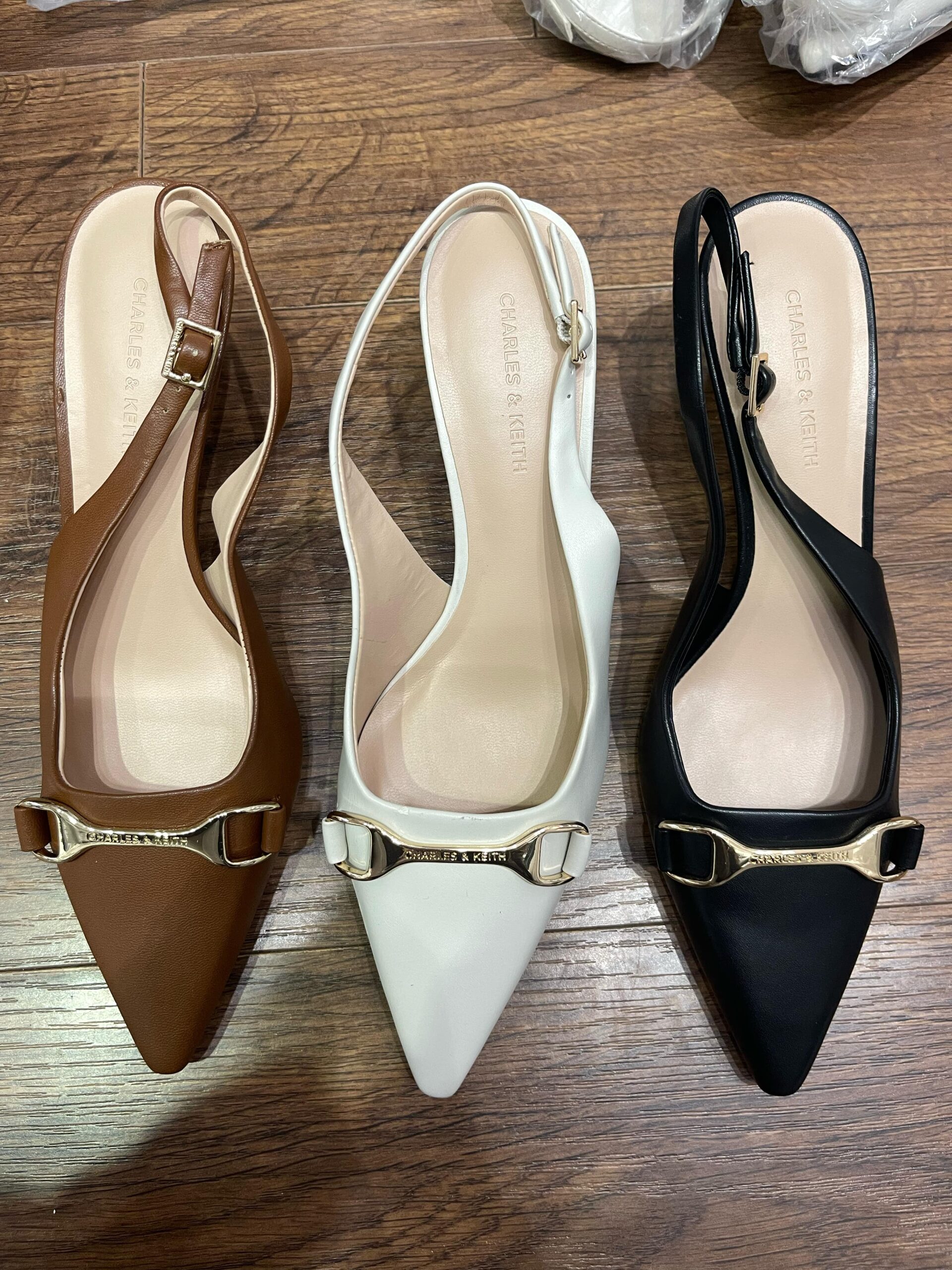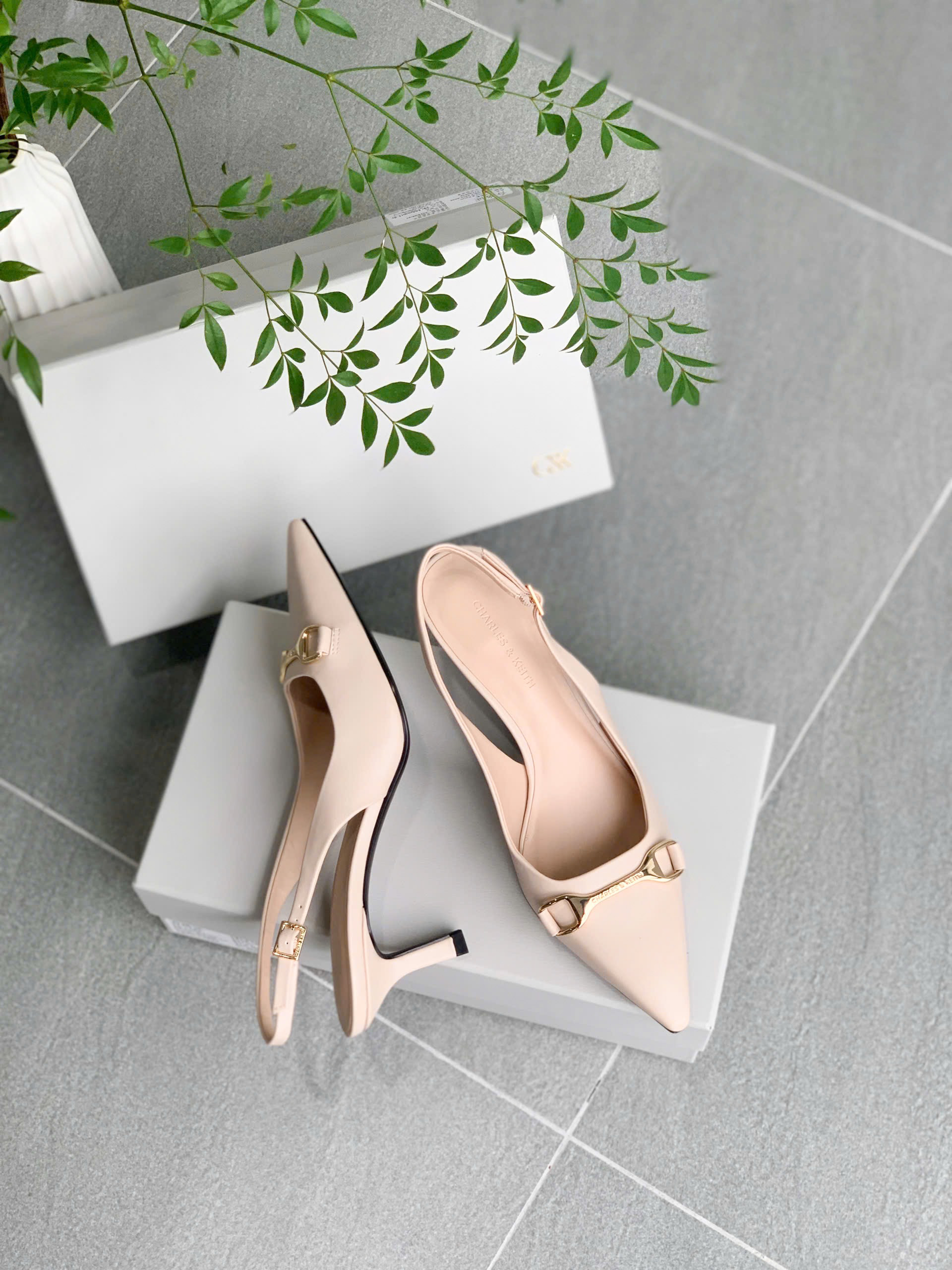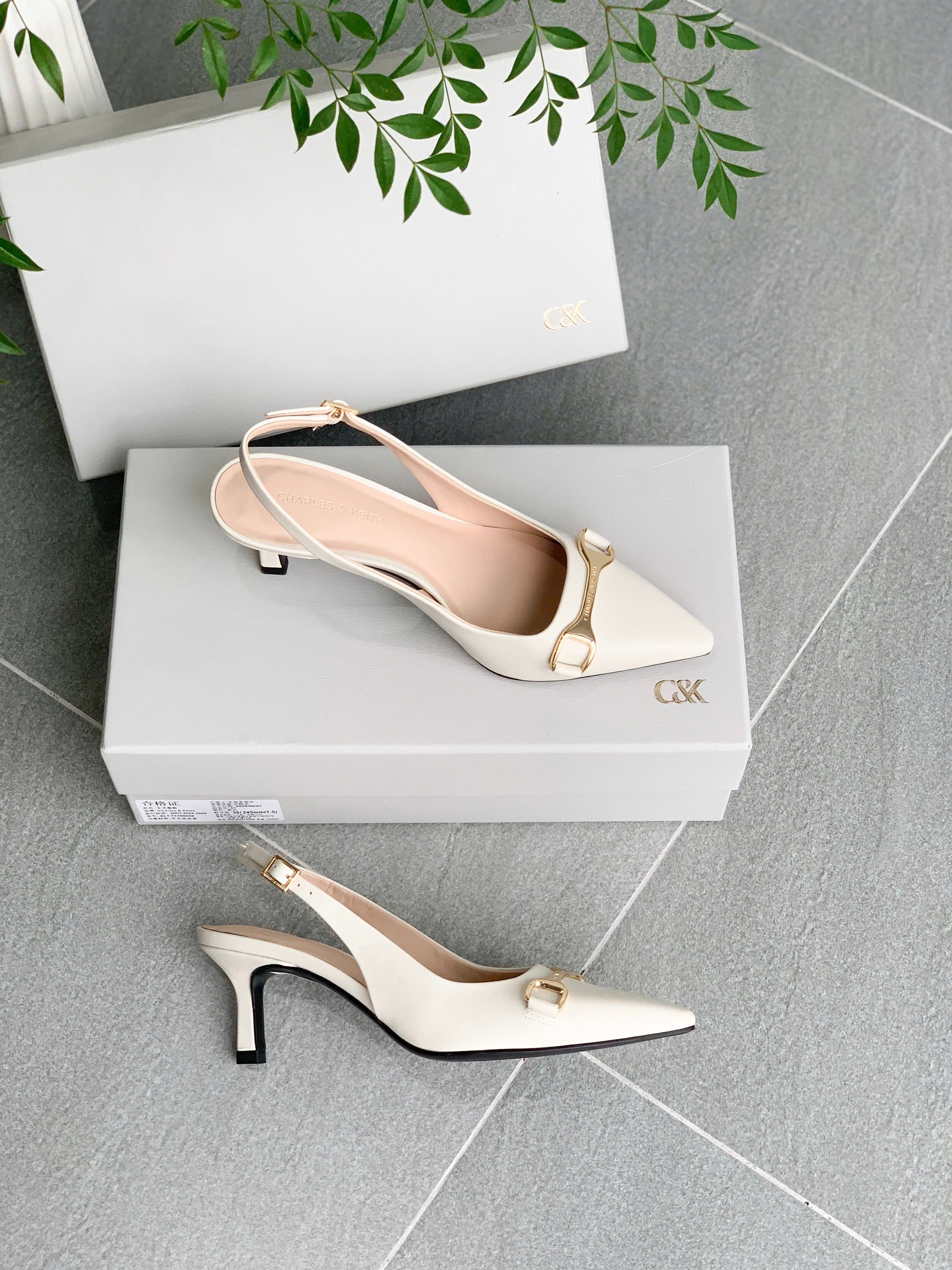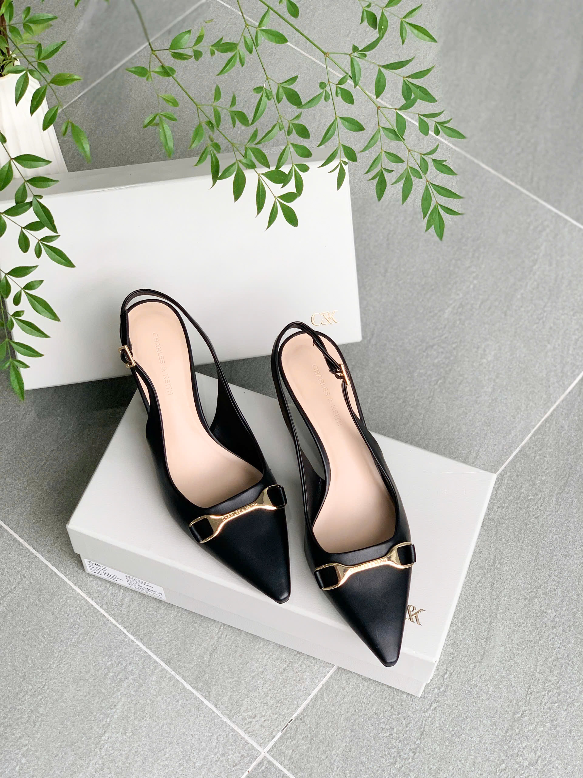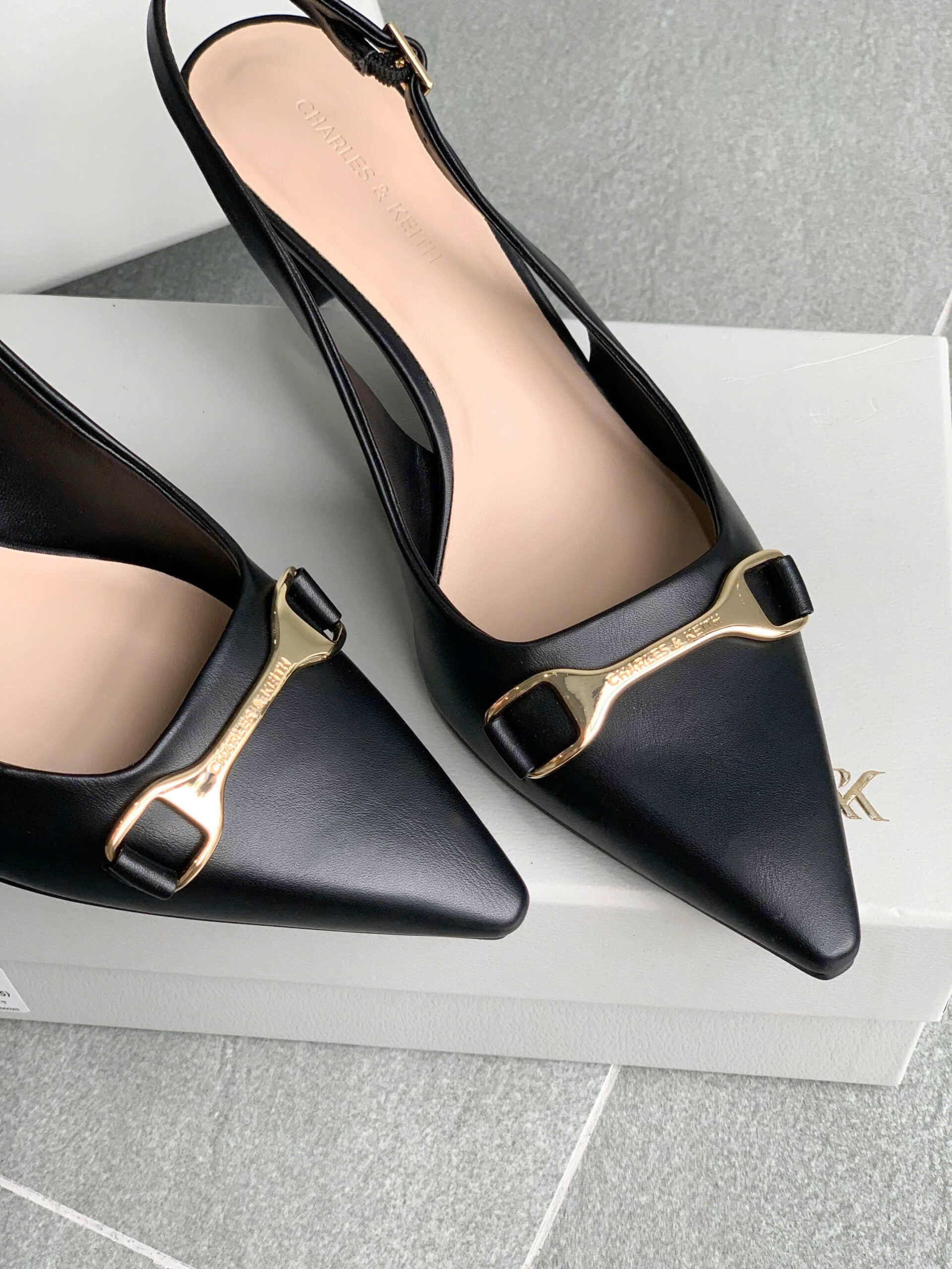 Giày Slingback mũi nhọn, thiết kế quai hậu có thể điều chỉnh bằng khóa kim loại chắc chắn, tạo sự vừa vặn và thoải mái cho người mang. Nơ kim loại trang trí trước giày làm tăng thêm nét sang trọng và điểm nhấn hiện đại.