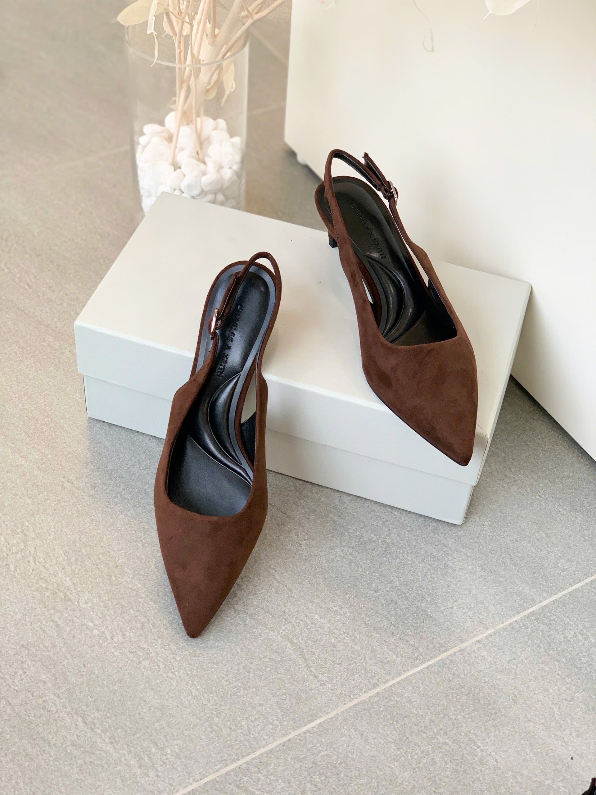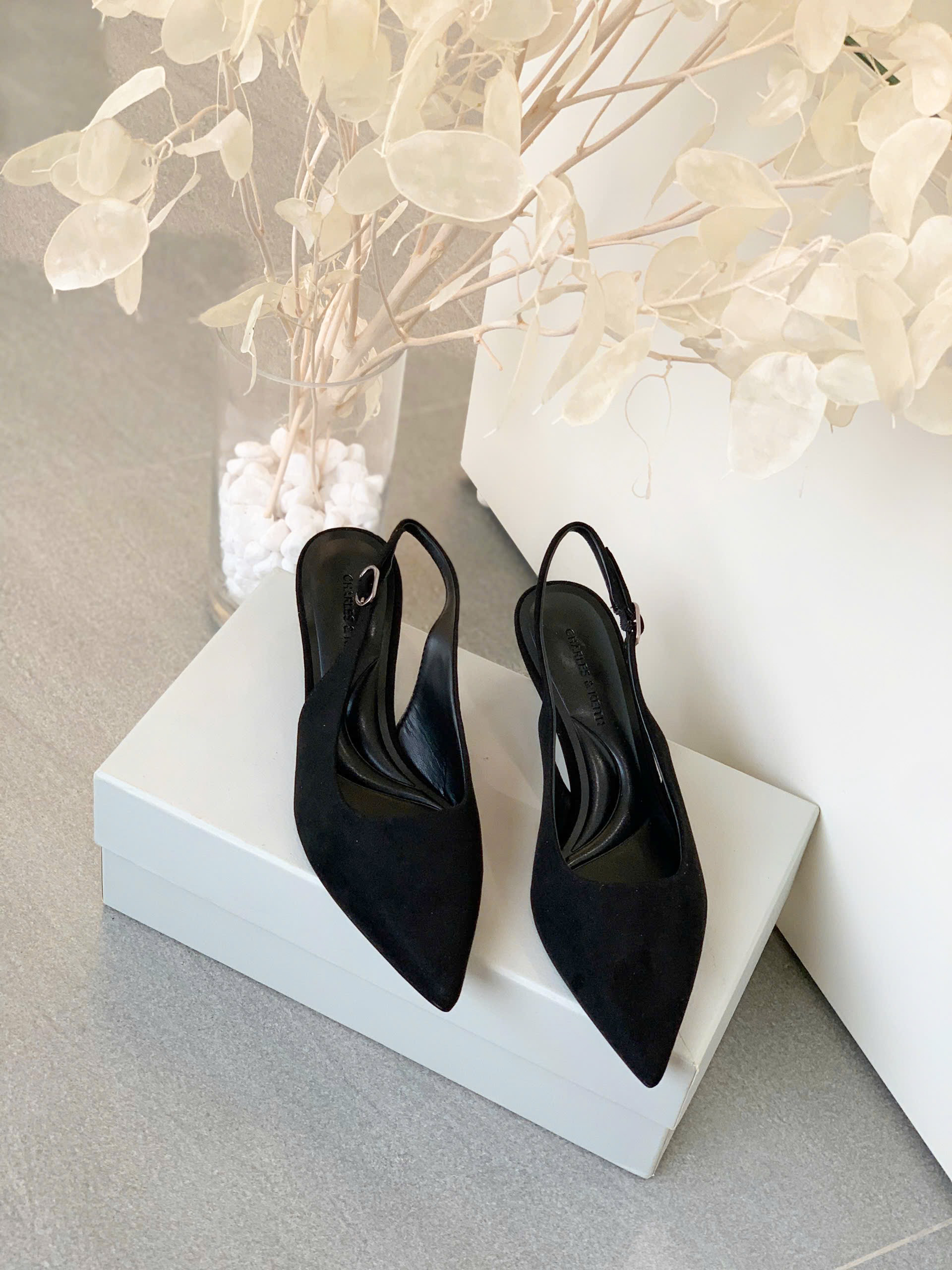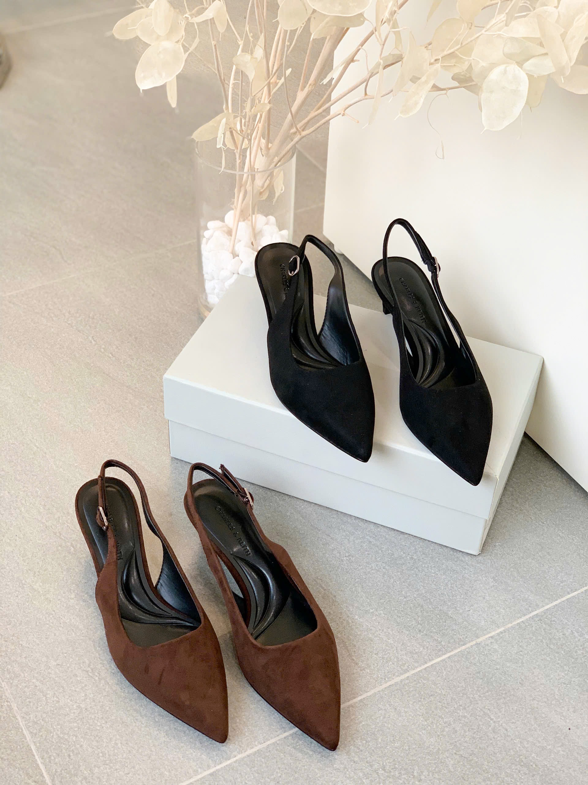 Giày cao gót slingback thiết kế mũi nhọn thanh lịch, phối quai ôm sát giúp tăng sự chắc chắn và thoải mái. – Kiểu dáng: Giày slingback – Chất liệu: Bên ngoài vải da lộn, lót PU, đế PU – Chiều cao: 5cm
