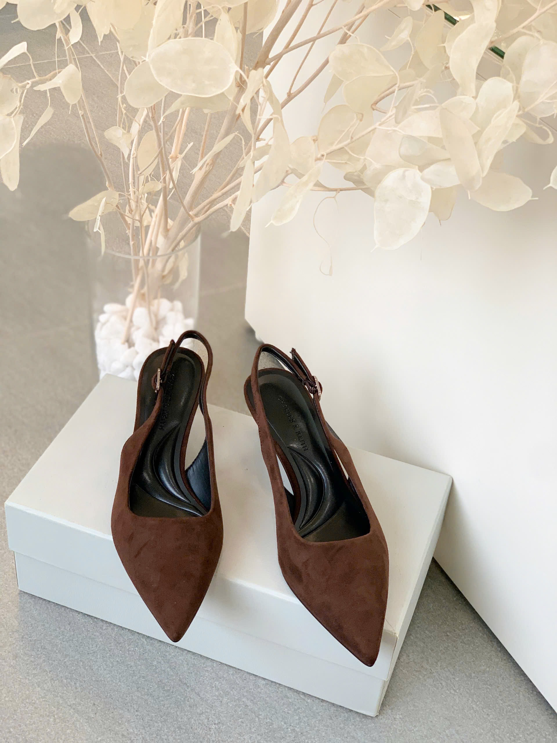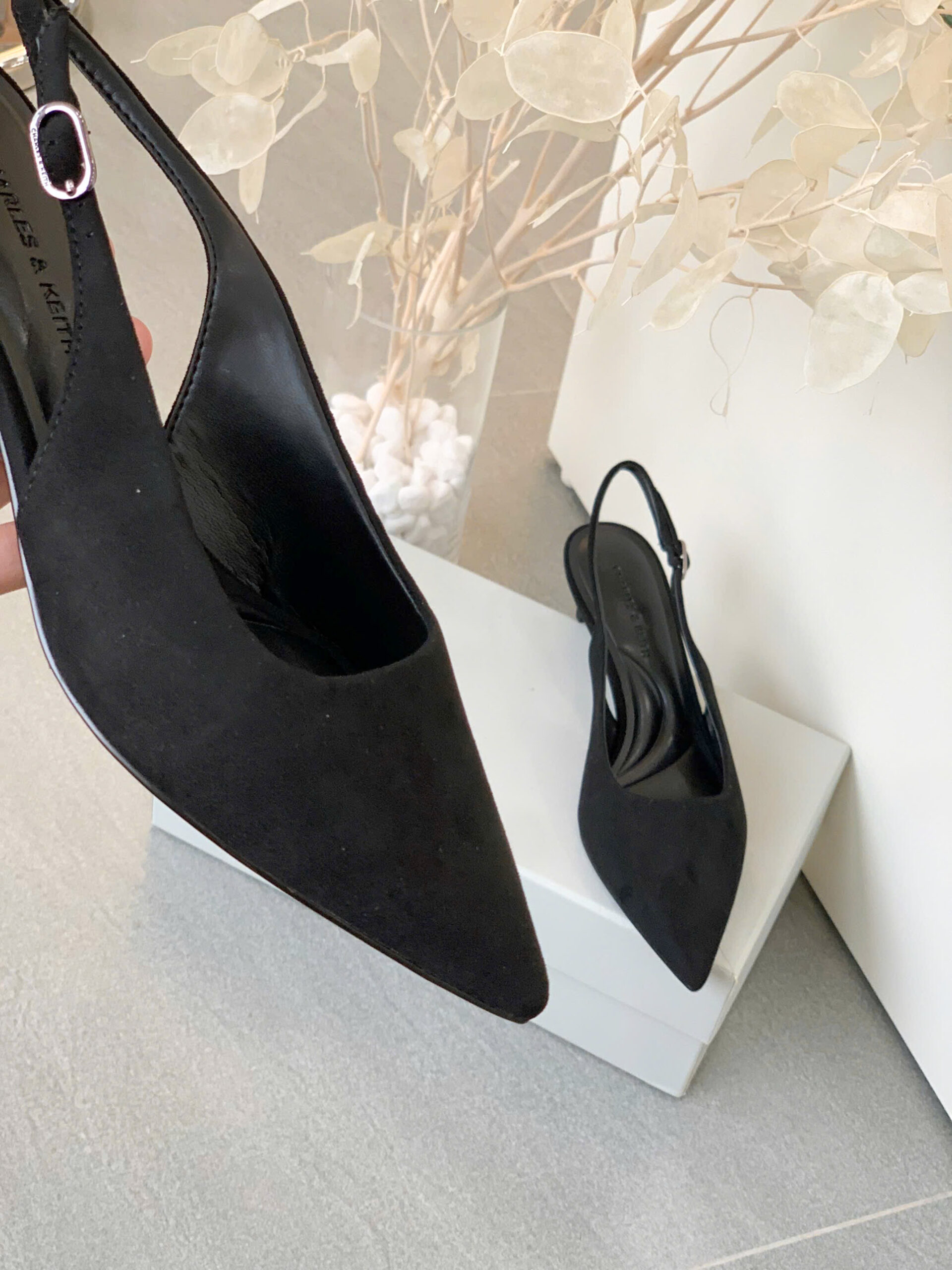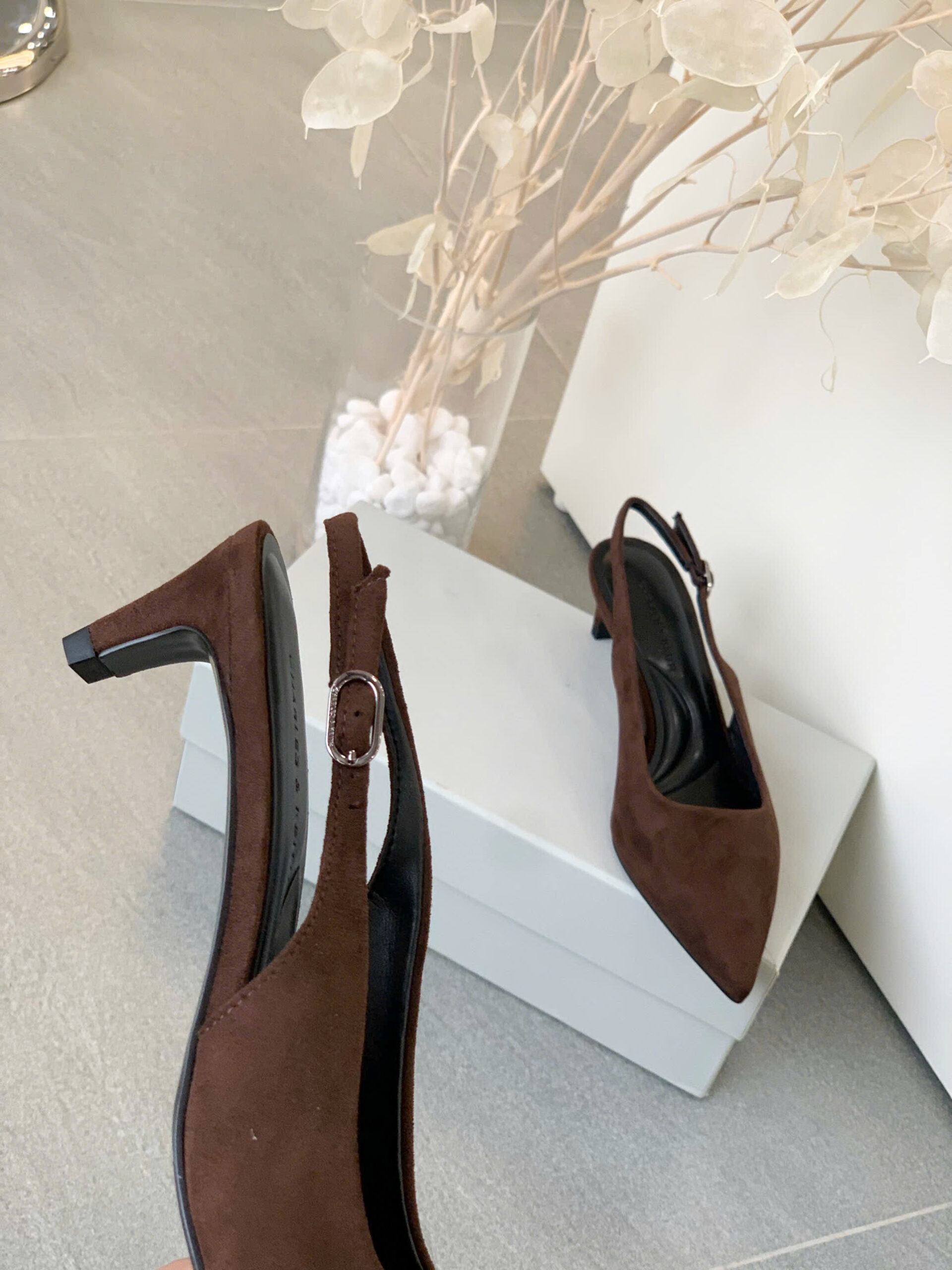 Giày cao gót slingback thiết kế mũi nhọn thanh lịch, phối quai ôm sát giúp tăng sự chắc chắn và thoải mái. – Kiểu dáng: Giày slingback – Chất liệu: Bên ngoài vải da lộn, lót PU, đế PU – Chiều cao: 5cm