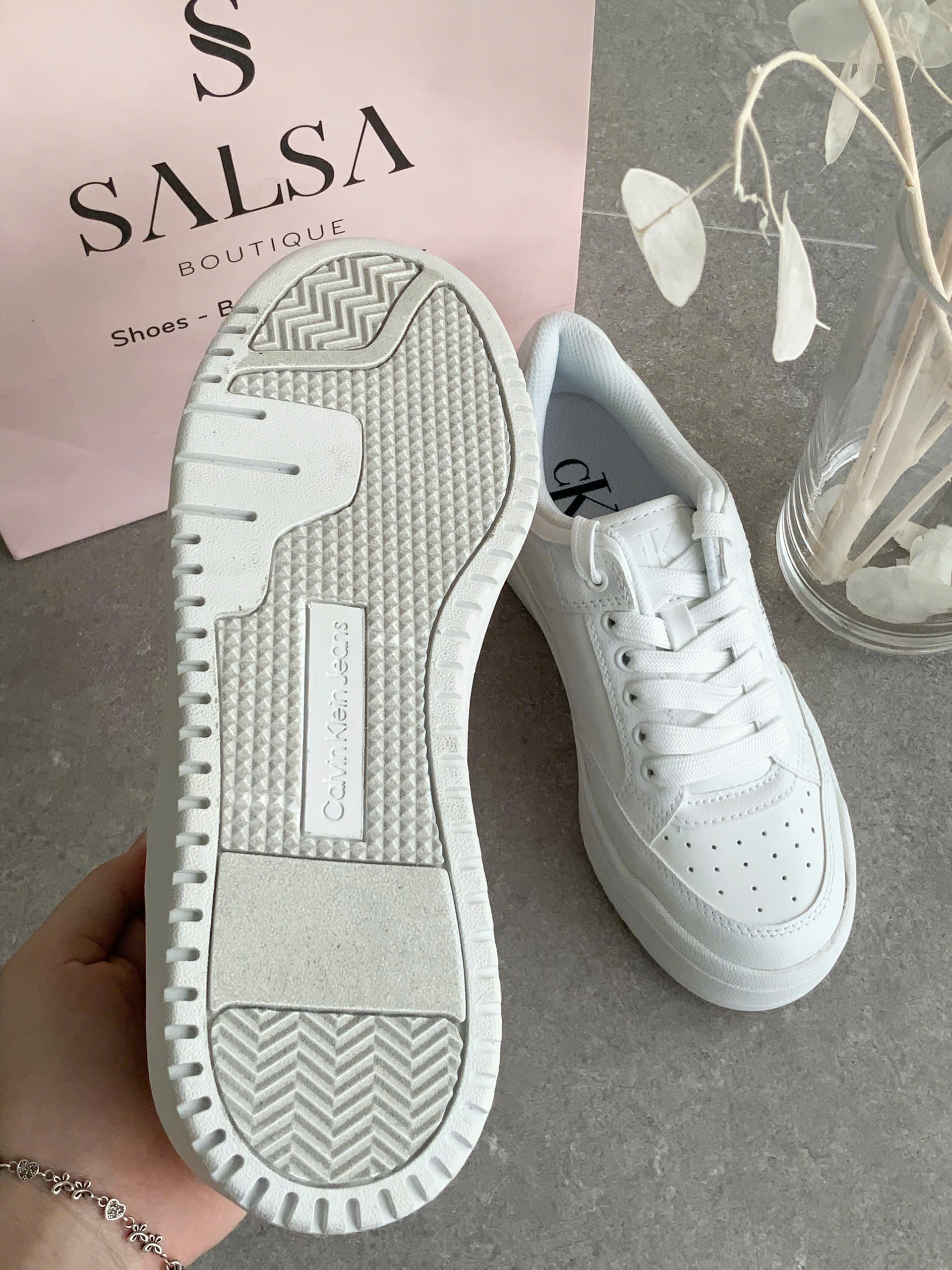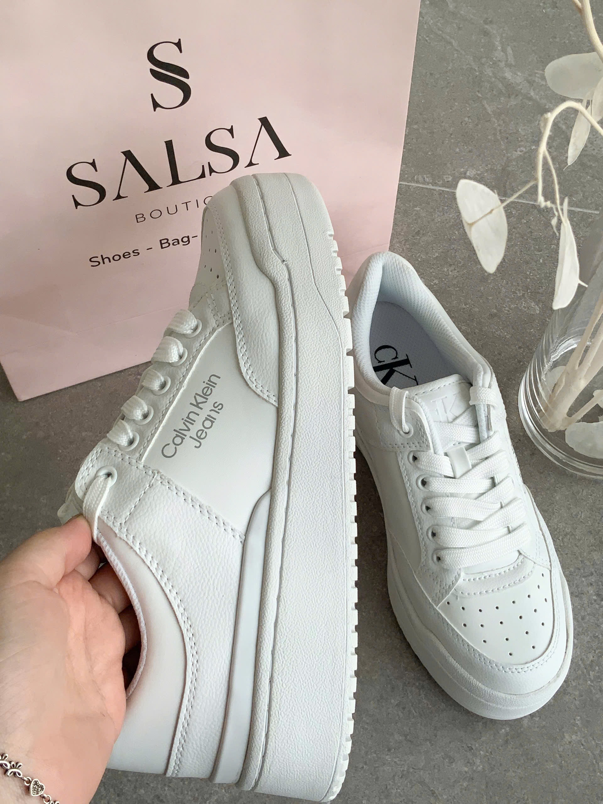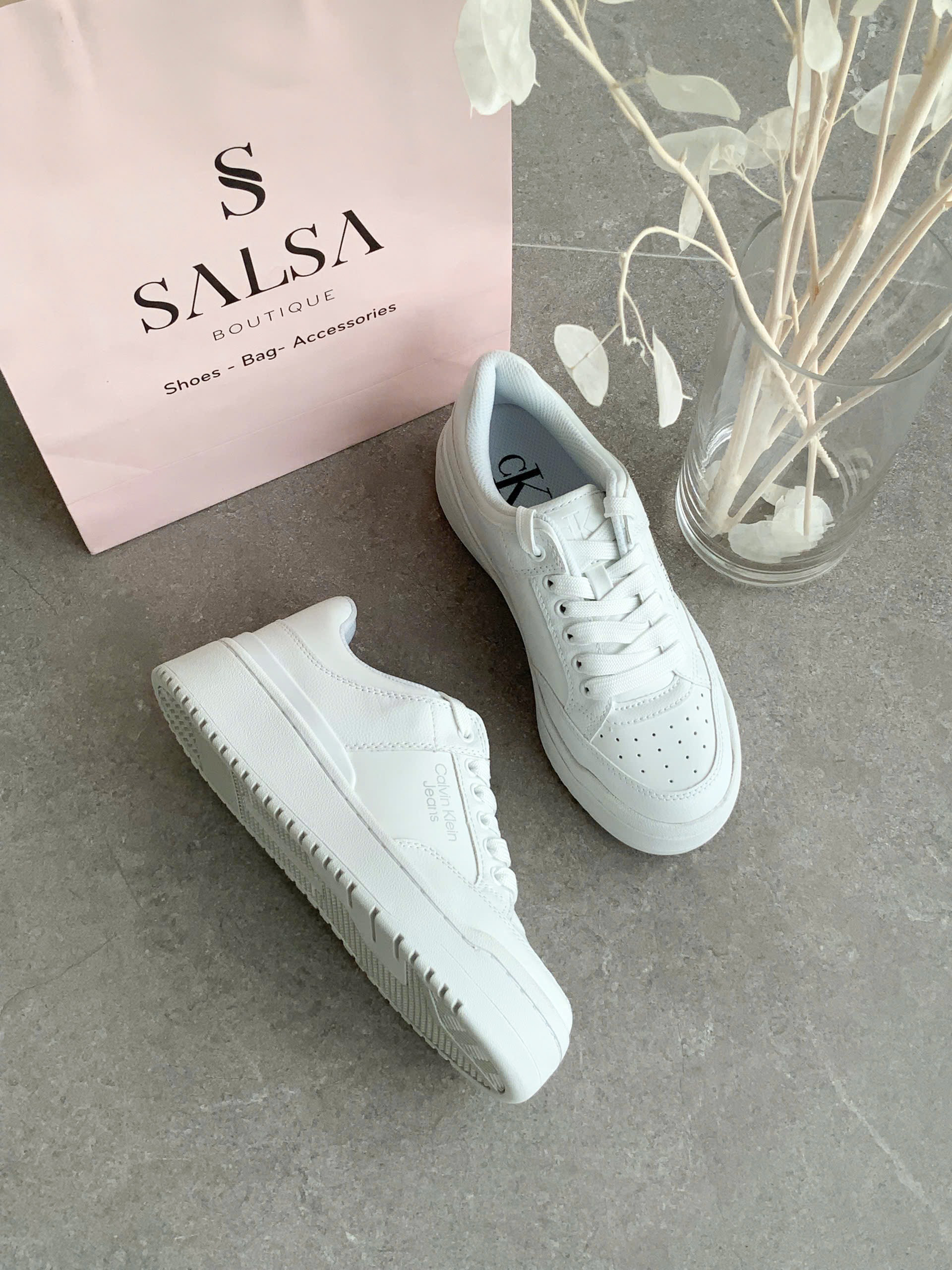 Đôi giày sneakers trắng đơn giản nhưng sang trọng, với logo “CK” tinh tế ở bên hông. Thiết kế cổ điển với đế cao su chắc chắn, phù hợp cho các hoạt động hàng ngày hoặc dạo phố. Chất liệu da bền bỉ, dễ phối hợp với nhiều trang phục, mang lại vẻ ngoài năng động và hiện đại.